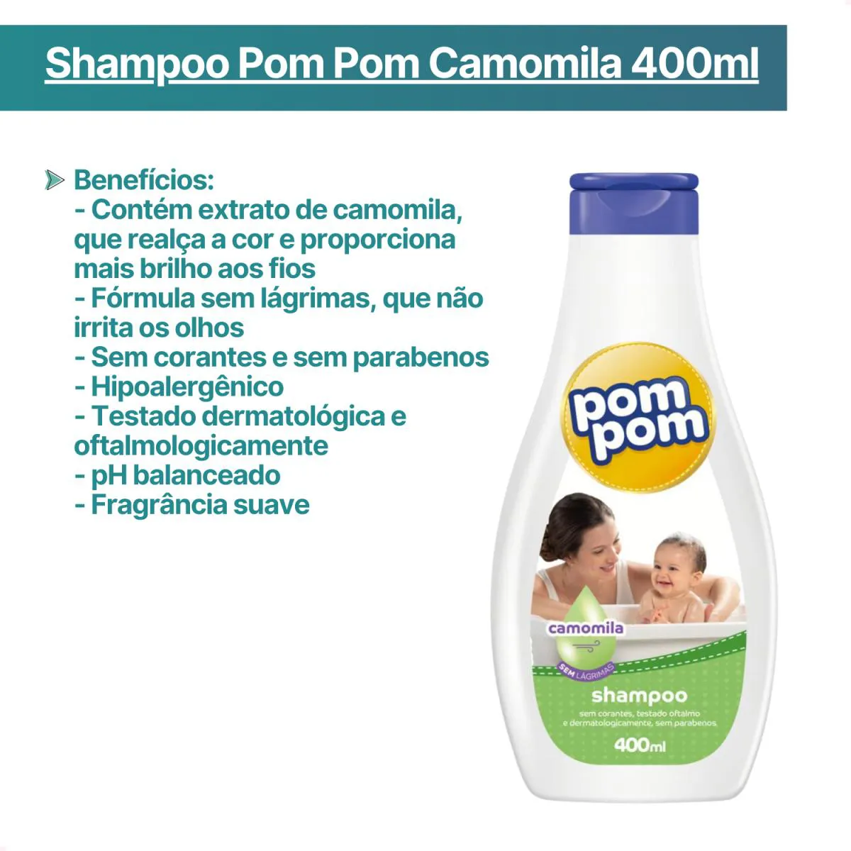 O Shampoo Pom Pom Camomila foi especialmente desenvolvido para cuidar dos cabelos delicados do bebê, tornando o banho um momento de carinho e suavidade. Sua fórmula contém extrato de camomila, que realça a cor natural dos fios e proporciona mais brilho e maciez.