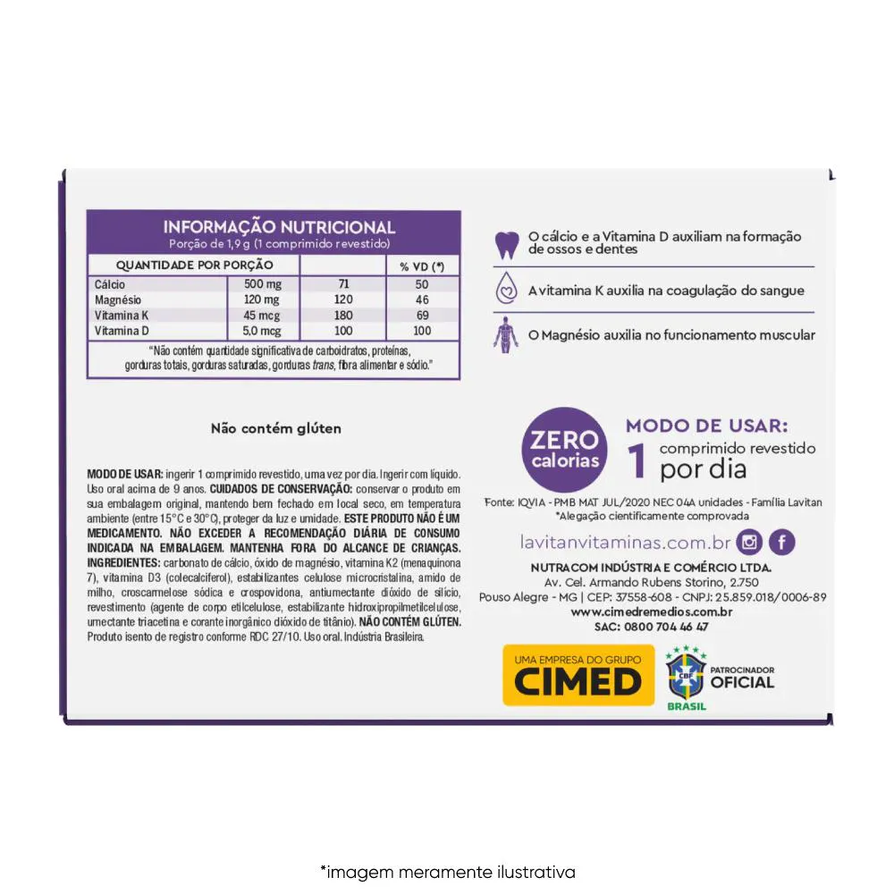 Lavitan Cálcio MDK é um suplemento alimentar de Vitaminas e minerais em comprimidos revestidos. O cálcio auxilia na formação e manutenção de ossos e dentes. A vitamina d auxilia na formação de ossos e dentes. O Magnésio auxilia no funcionamento muscular. A vitamina K auxilia na manutenção dos ossos.
