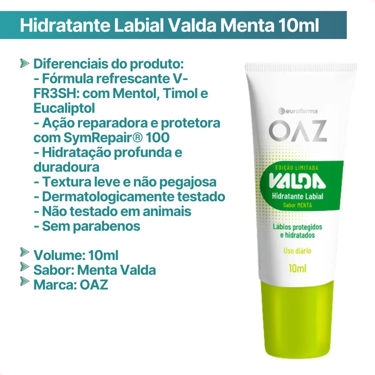 O Hidratante Labial OAZ Valda Menta combina hidratação profunda com uma sensação única de refrescância. Enriquecido com Manteiga de Karité e vitamina e, oferece nutrição intensa e ação antioxidante. Conta ainda com o exclusivo SymRepair® 100, que ajuda a restaurar e proteger os lábios contra o ressecamento diário.