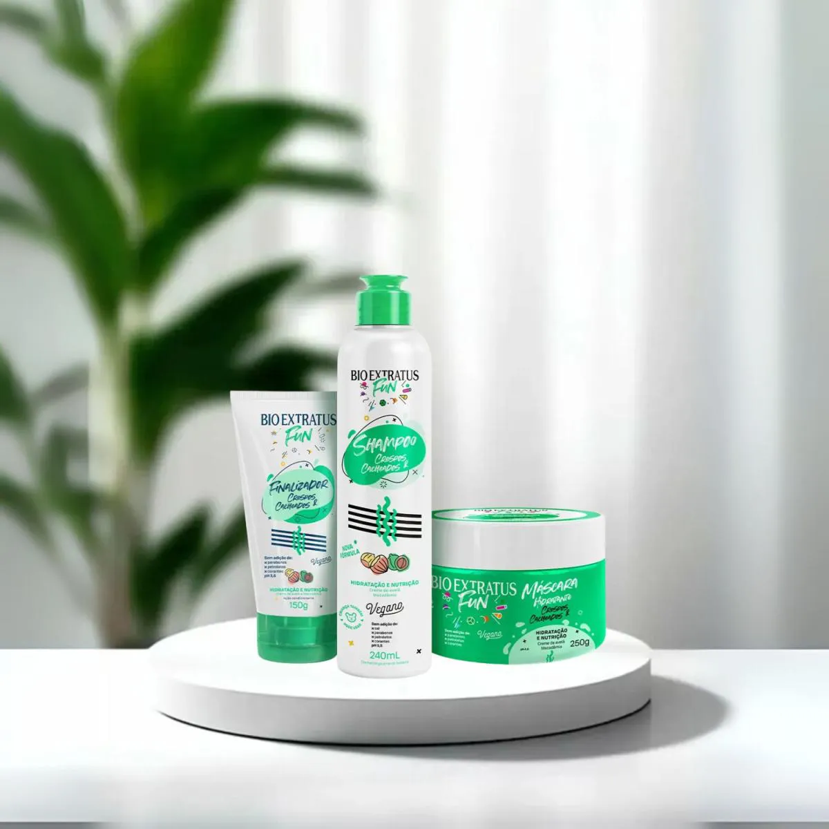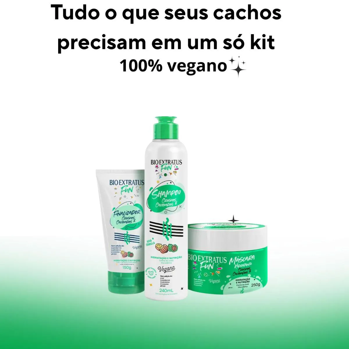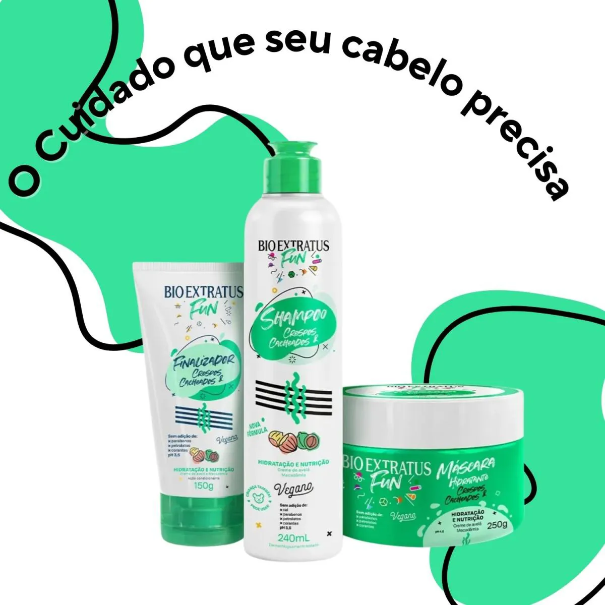Kit Completo Crespos e Cacheados Fun- Bio Extratus Rotina 3 passos para crespos e cacheados: limpa suavemente, trata com hidratação + nutrição e finaliza com definição, brilho e proteção. Resultado: cachos macios, com menos frizz e movimento natural. Diferenciais: · Limpeza suave que não resseca · Hidratação e nutrição equilibradas para definição duradoura · Menos frizz, mais maciez e brilho · finalizador com proteção térmica e antiumidade · Fórmulas leves que não pesam (curvaturas 2A a 4C) Dúvidas Frequentes: Pesa nos fios finos? Não, ajuste a quantidade (menos máscara e pouco finalizador).