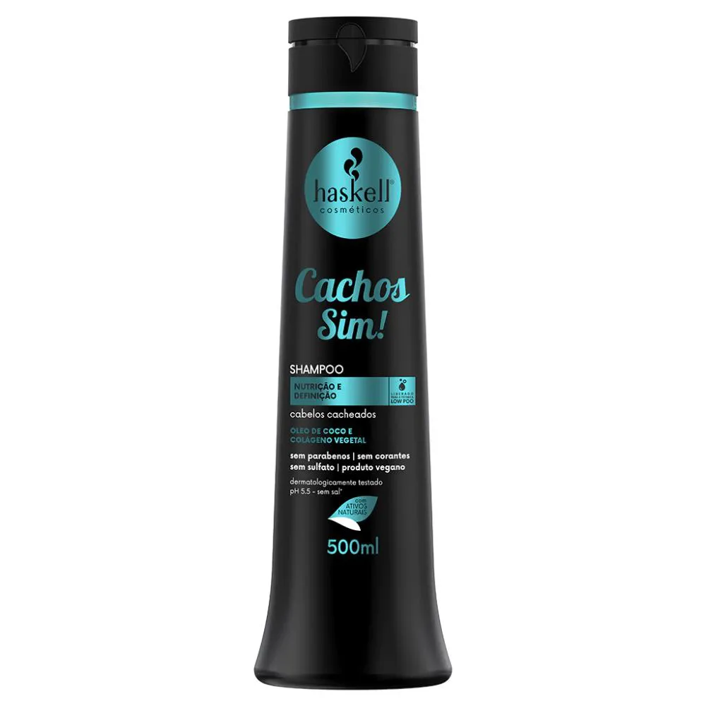 shampoo Cachos Sim! Sem sulfato, promove limpeza suave, sem remover os óleos naturais dos fios.