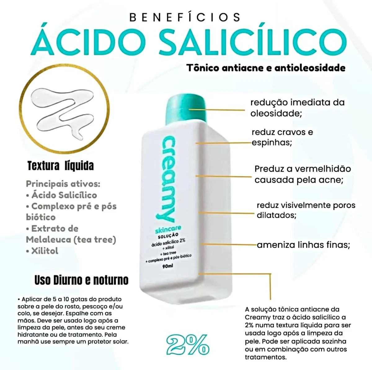 O que é: Uma solução tônica líquida antiacne. Para que serve: Reduz oleosidade, desobstrui poros, realiza esfoliação química superficial, previne cravos e espinhas, equilibra a microbiota da pele e controla a proliferação de bactérias nocivas.