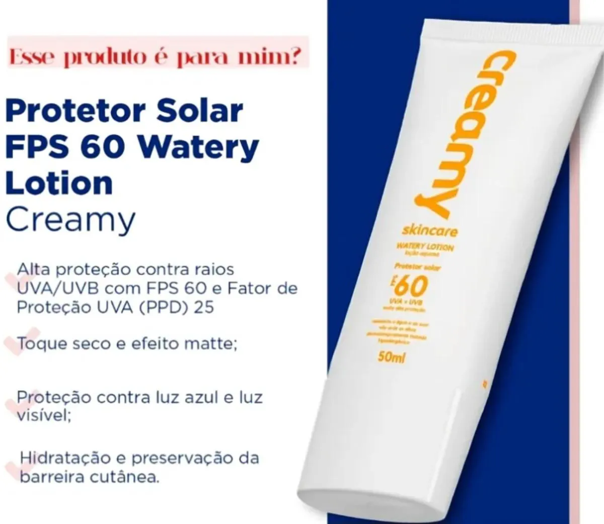 O que é e para que serve o Kit Creamy Skincare Watery Lotion FPS60 protetor solar Facial 50ml + Calming Cream Gel Creme Hidratante 40g?