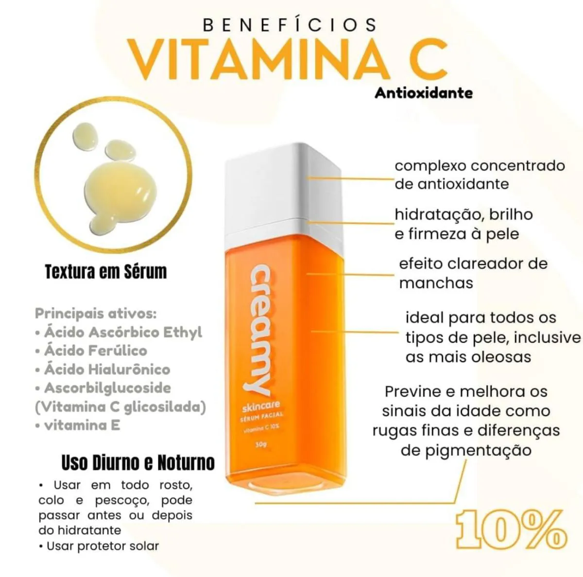 Agite antes de usar. Uso diário. Aplique abundantemente antes da exposição ao sol, com a pele seca. Reaplicar sempre, após sudorese intensa, nadar ou banhar-se, secar-se com toalha e durante a exposição ao sol. Se a quantidade aplicada não for adequada, o nível de proteção será significativamente reduzido. É necessária a reaplicação do produto para manter a sua efetividade. O sérum antioxidante da Creamy tem 10% de vitamina C. A Ethyl-Vitamina-C e a Vitamina C Glicosilada foram combinadas para entregar alto poder antioxidante, clareador e anti-aging, prevenindo e melhorando sinais da idade como rugas finas e diferenças de pigmentação. Os antioxidantes são poderosos ativos que neutralizam a ação dos radicais livres, causadores de manchas na pele, rugas e flacidez. O uso prolongado da Vitamina C melhora a qualidade da pele, uniformizando o tom, prevenindo e atenuando rugas. O ativo principal foi associado a outros antioxidantes consagrados como a vitamina e e o ácido ferúlico, complementando o potencial antioxidante e estabilizando a fórmula. Possui textura leve, de rápida absorção, ideal para todos os tipos de pele, inclusive as mais oleosas. Conselho de Aplicação: Uso diurno e/ou noturno. Aplicar 1 ou 2 pumps sobre a pele completamente seca, espalhando até absorção completa. Pode ser utilizada no rosto, pescoço e/ou colo, antes ou depois do creme hidratante. De manhã, recomenda-se a aplicação antes do protetor solar.