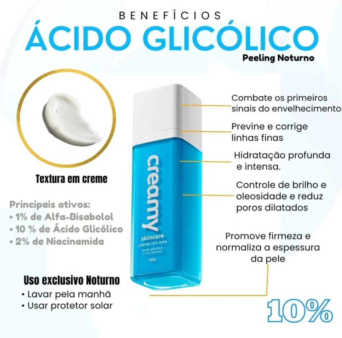 - Ácido glicólico renova células e uniformiza textura e tom da pele.