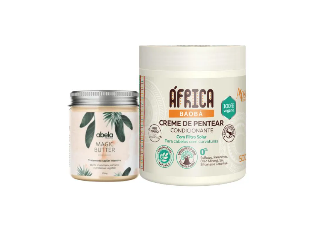 Apresentamos o Kit Magic Butter 250g e Creme de Pentear África Baobá 500g, uma combinação perfeita para revitalizar e realçar a beleza natural dos seus cabelos.