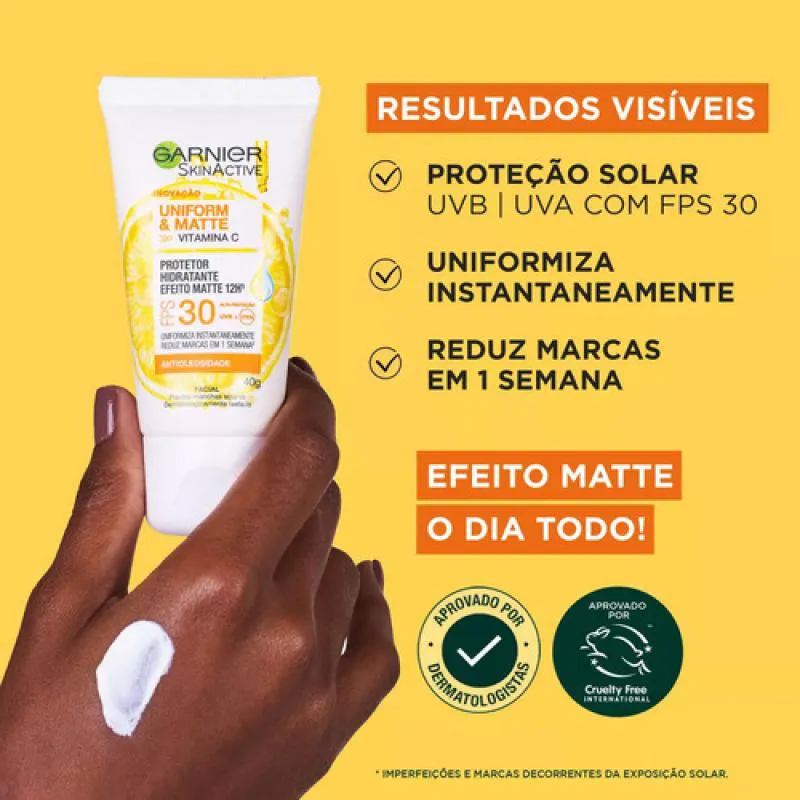 Pensando nisso, Garnier criou o novo Protetor Hidratante Facial Uniform & Matte FPS 30 e Vitamina C com ação antioxidante que controla a oleosidade, uniformiza e reduz imperfeições da pele.