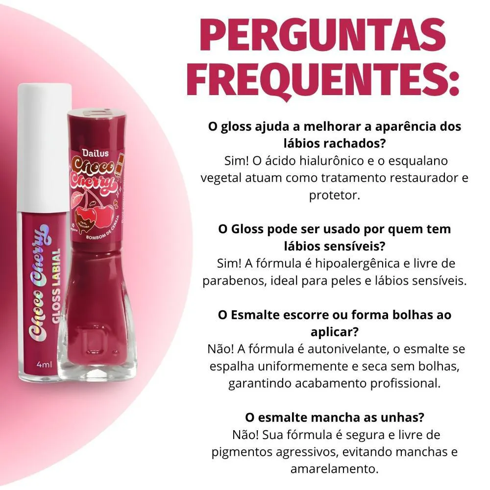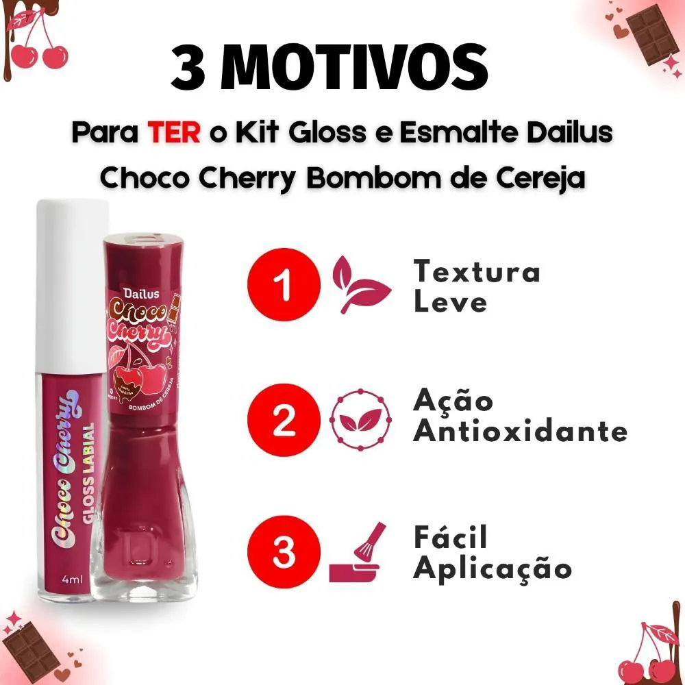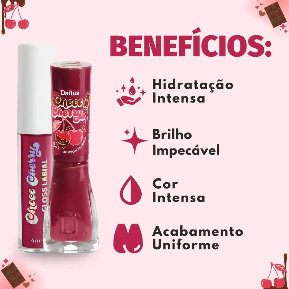 O Kit Dailus Choco Cherry Bombom De Cereja é um conjunto de maquiagem composto por um gloss labial de 4ml e um esmalte cremoso de 8ml, ambos inspirados no tema "Bombom de Cereja" e pertencentes à coleção Choco Cherry da marca Dailus.