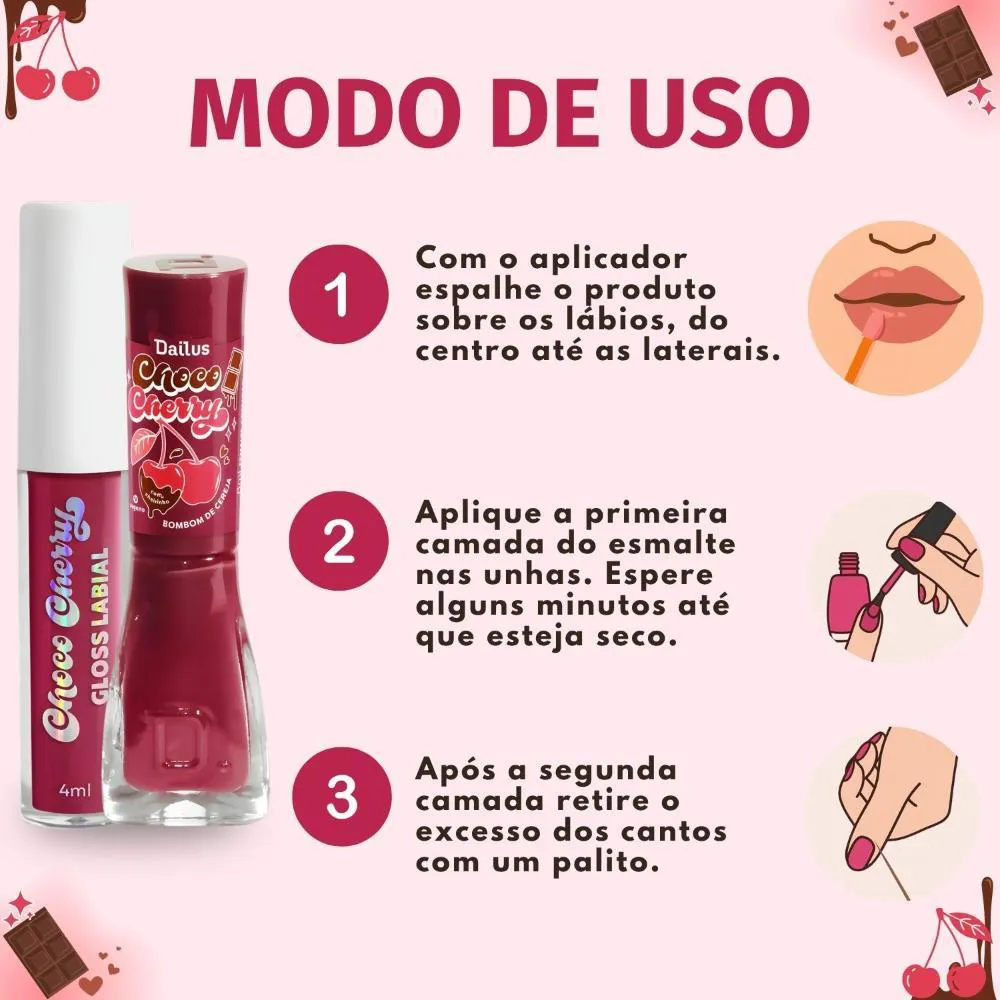Como usar o Kit Dailus Choco Cherry Bombom De Cereja: Gloss Labial 4Ml E Esmalte Cremoso 8Ml?