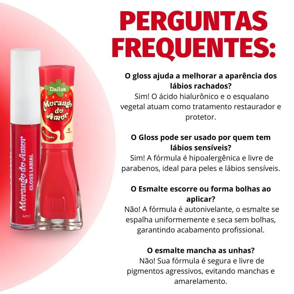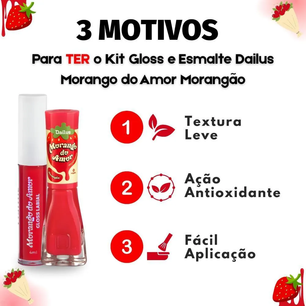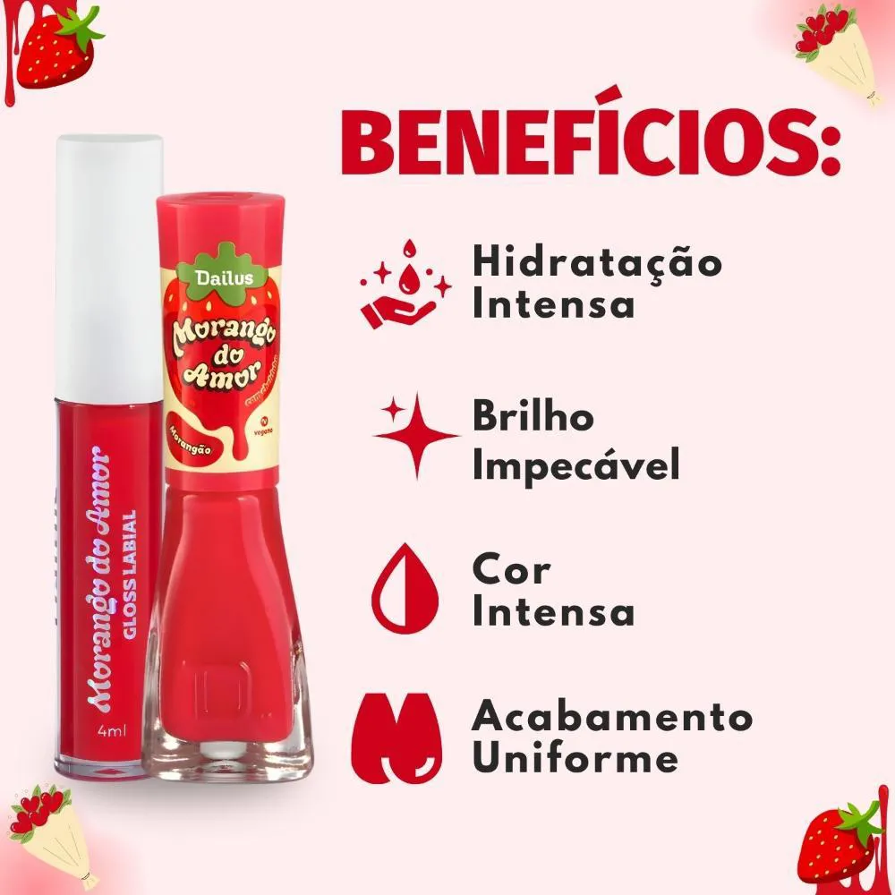 Kit Dailus Morango do Amor Morangão: Gloss Labial 4Ml e Esmalte Cremoso 8Ml