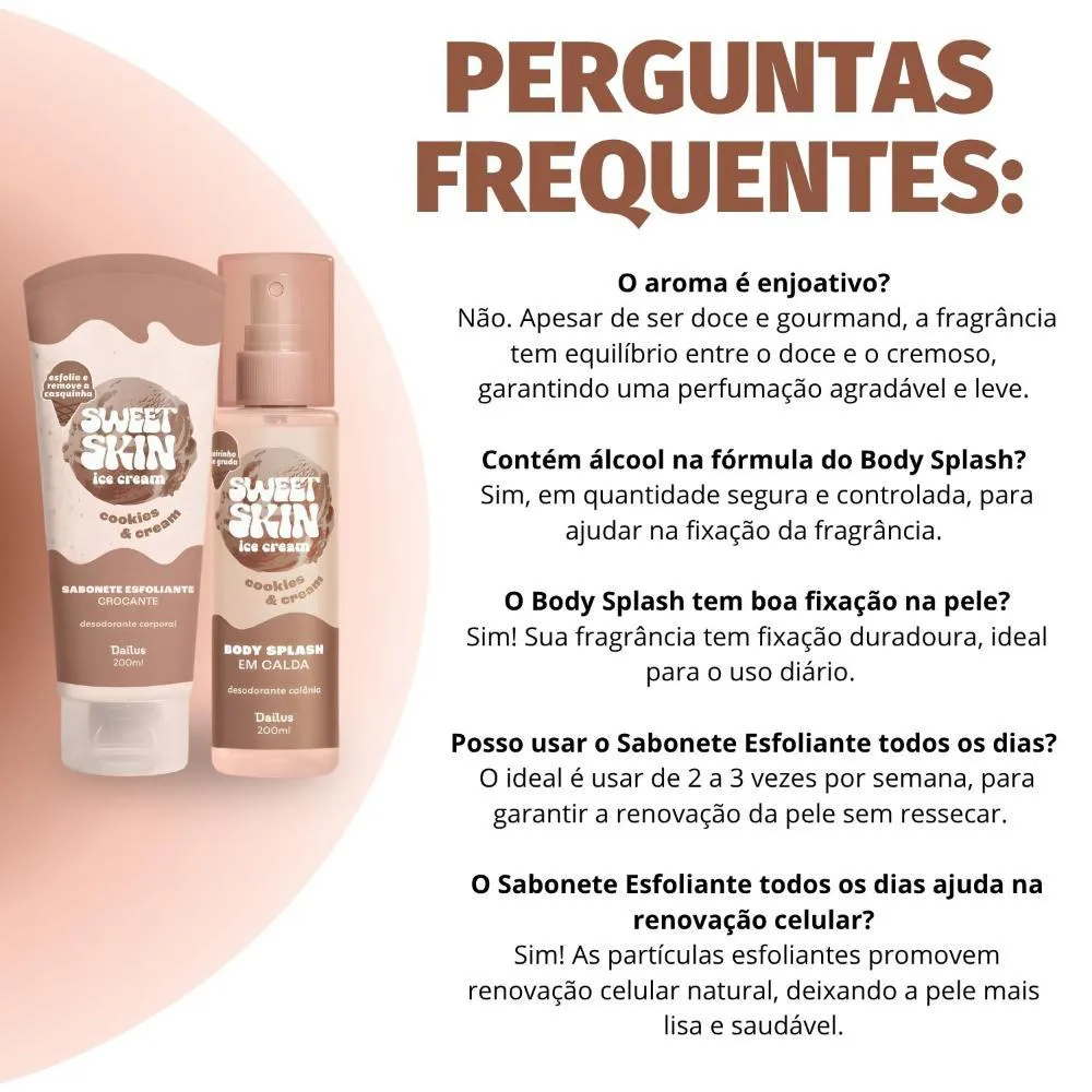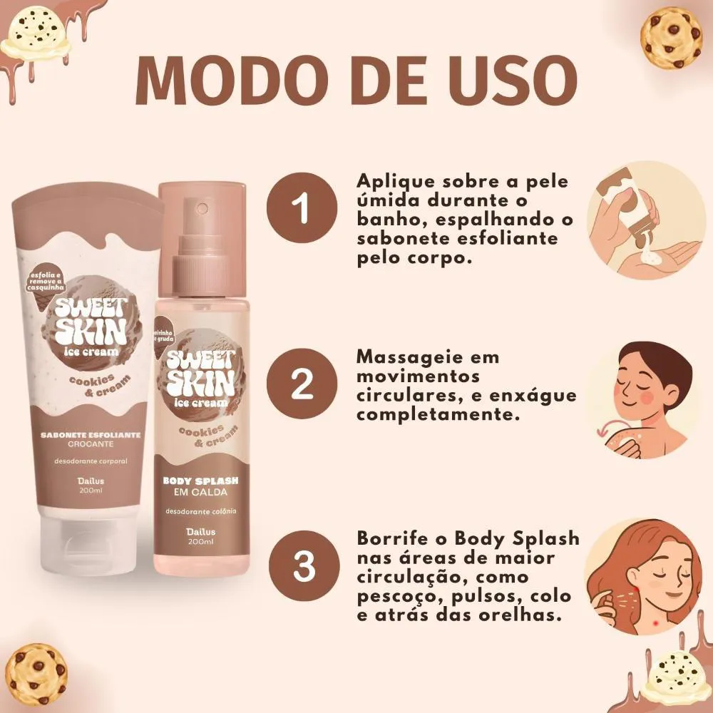O Kit Contém: - 1 Sabonete Esfoliante Crocante Corporal Sweet Skin Ice Cream Cookies e Cream 200ml - 1 Body Splash Em Calda Sweet Skin Ice Cream Cookies e Cream 200ml