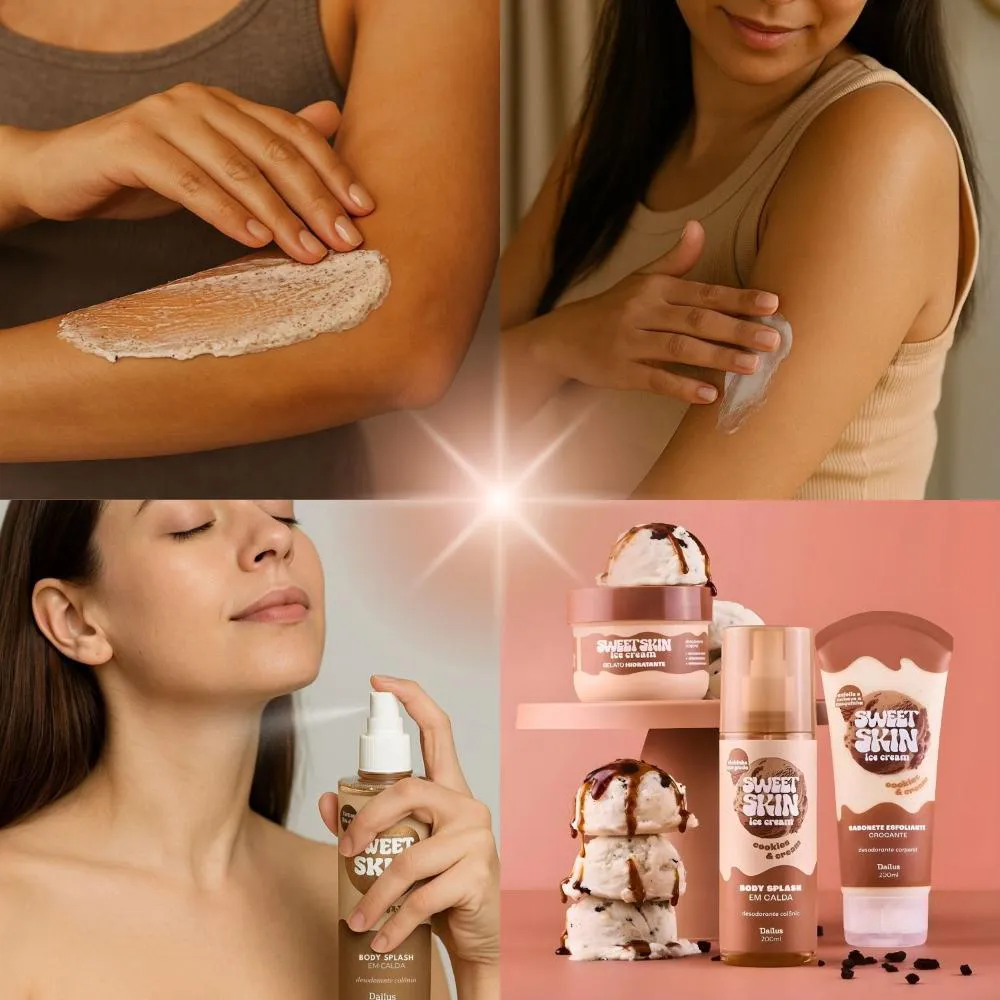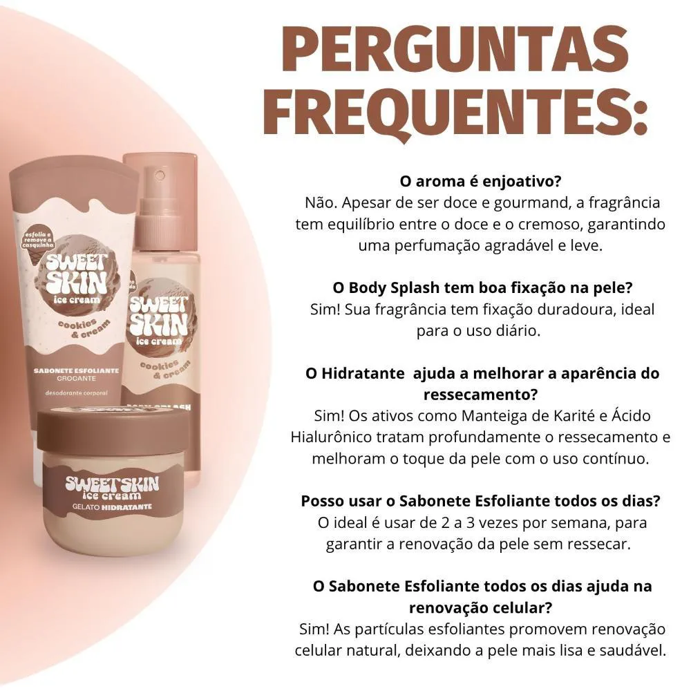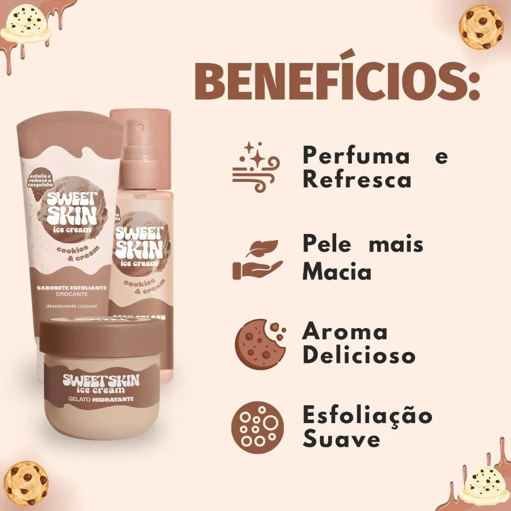O Kit Contém: - 1 Sabonete Esfoliante Crocante Sweet Skin Ice Cream Cookies e Cream 200ml - 1 Gelato Hidratante Corporal Sweet Skin Ice Cream Cookies e Cream 200ml - 1 Body Splash Em Calda Sweet Skin Ice Cream Cookies e Cream 200ml