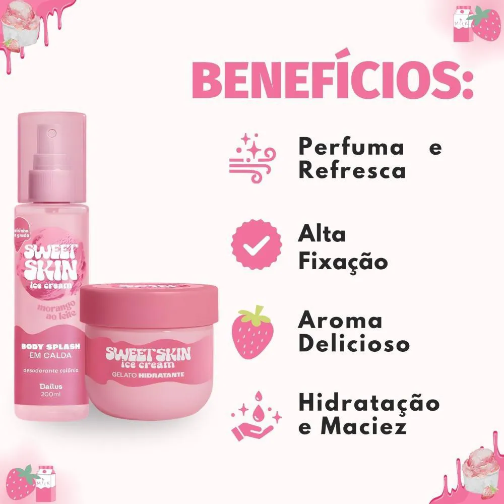 Kit Dailus Sweet Skin Ice Cream Morango Ao Leite: Body Splash e Hidratante Corporal 200ml