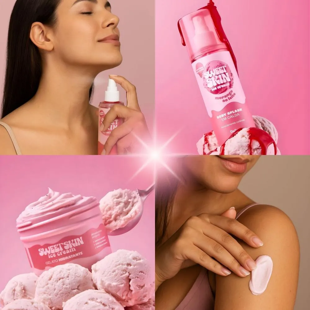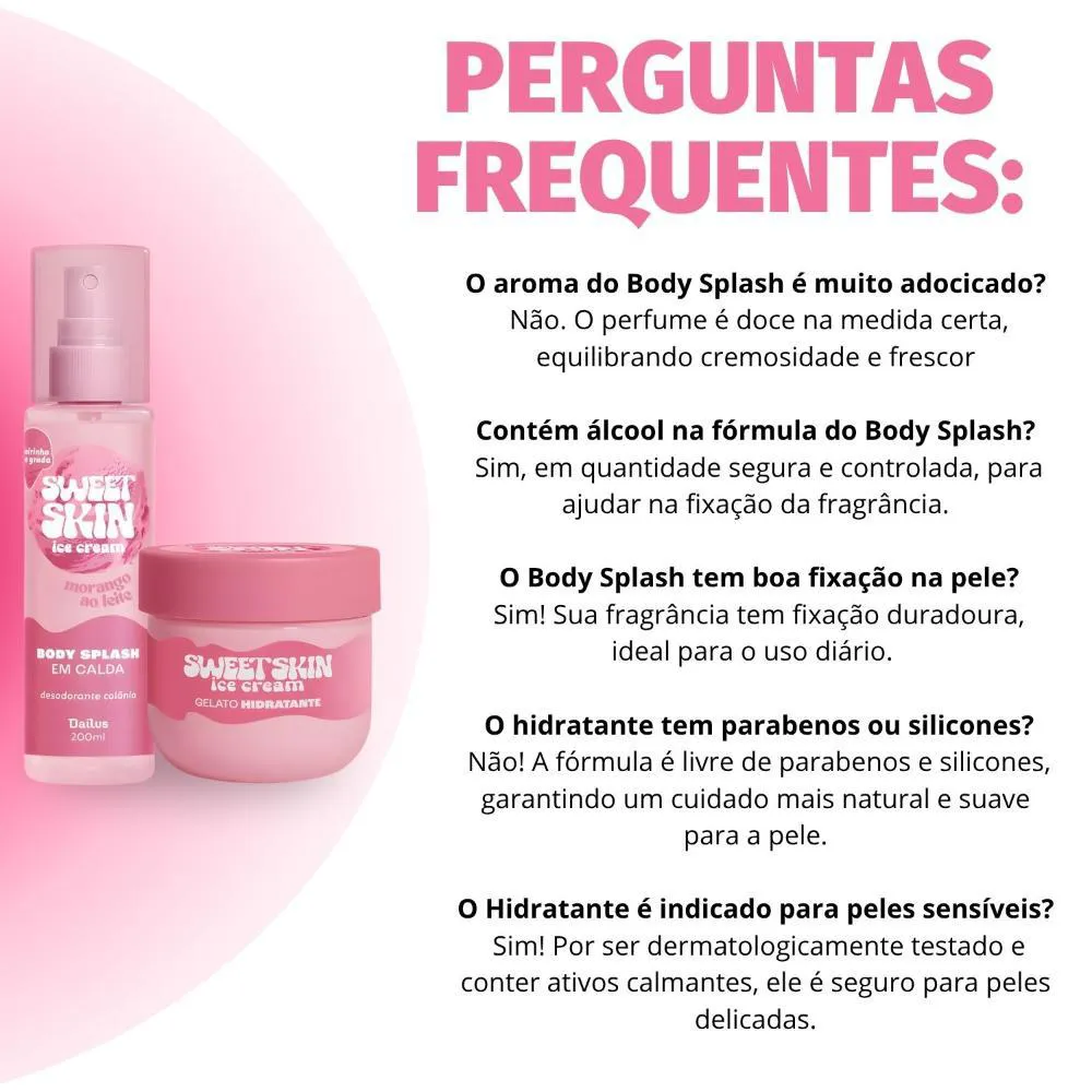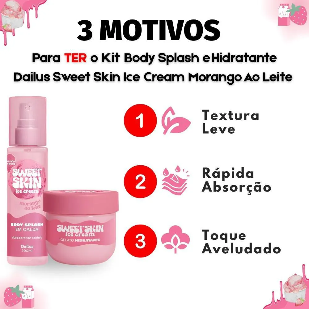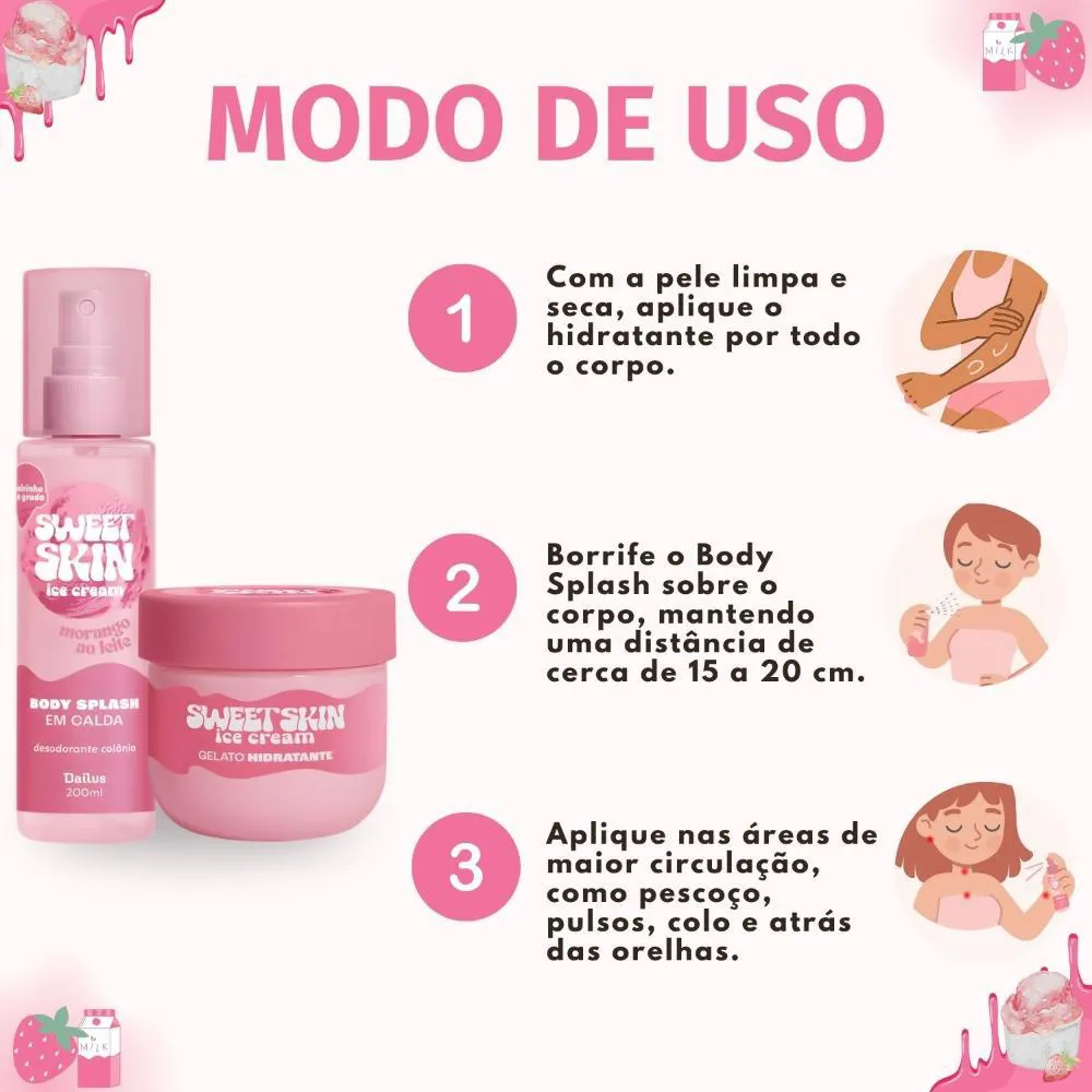 O Kit Dailus Sweet Skin Ice Cream Morango Ao Leite é ideal para o uso diário, transformando sua rotina de cuidados em um momento de puro prazer. Perfeito para ser aplicado após o banho, intensificando a fixação da fragrância e proporcionando uma sensação prolongada de frescor. Excelente para renovar o perfume e a hidratação da pele a qualquer momento do dia, ou como um presente encantador para quem você ama.Modo de Uso/Aplicação