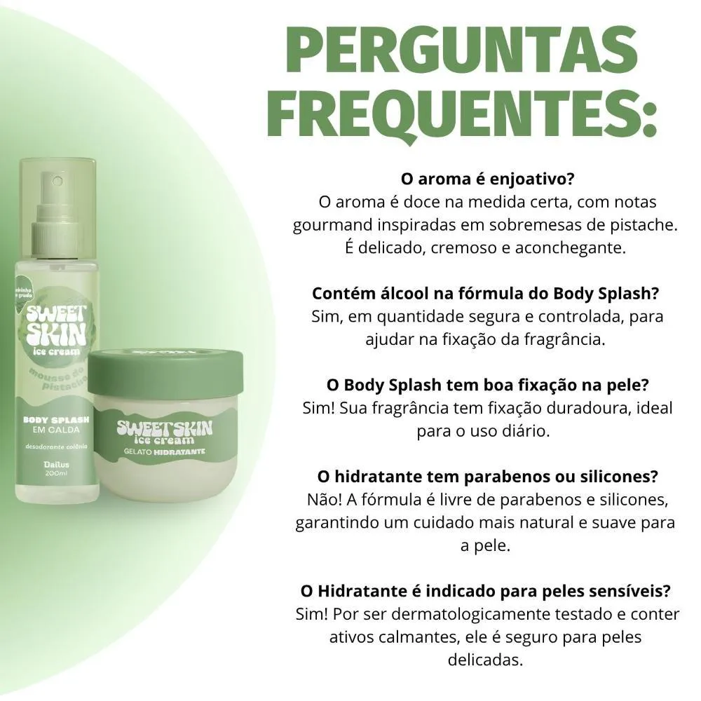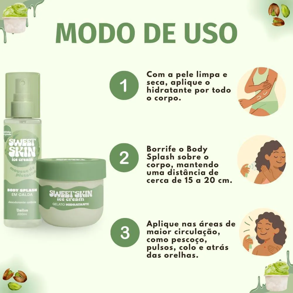 O Kit Contém: - 1 Body Splash Em Calda Sweet Skin Ice Cream Mousse De Pistache 200ml - 1 Gelato Hidratante Corporal Sweet Skin Ice Cream Mousse De Pistache 200ml