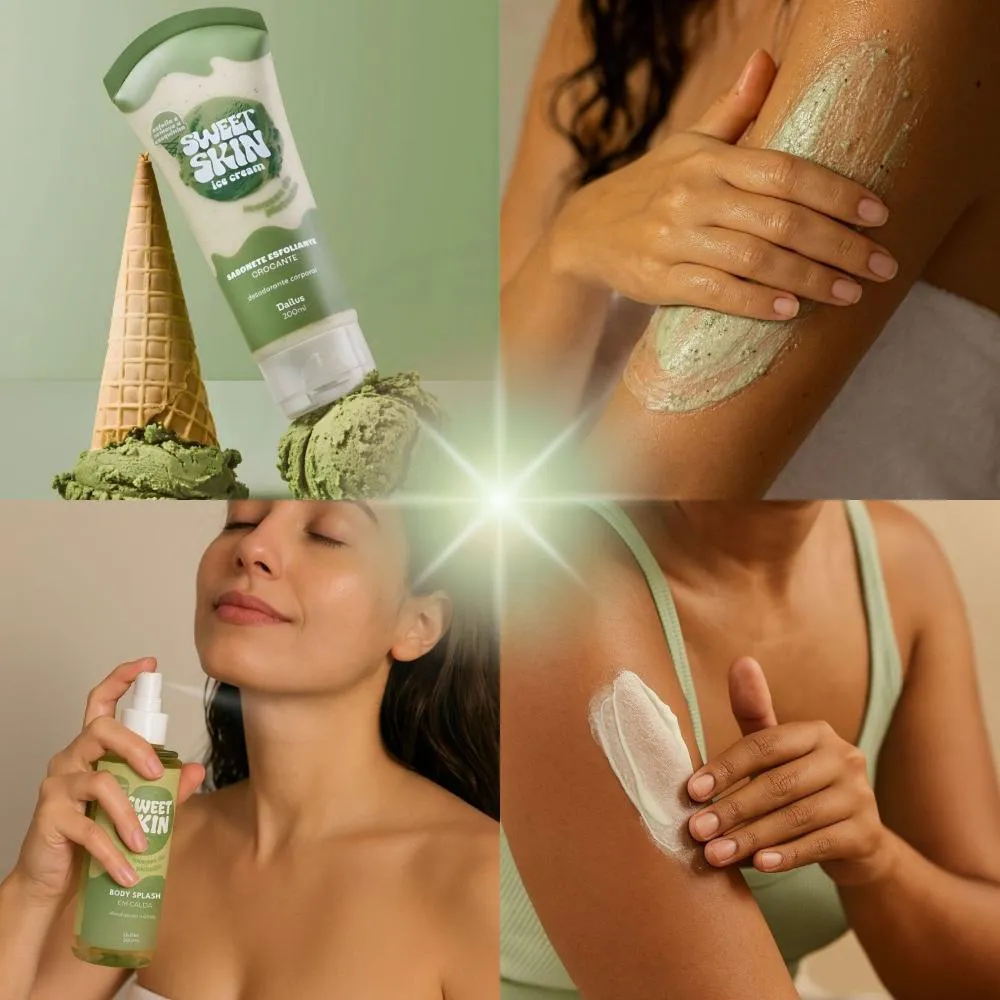 - Experiência sensorial de sorvete: Uma linha de cuidados corporais que remete à doçura e frescor do sorvete de pistache, tornando o autocuidado mais divertido e prazeroso.