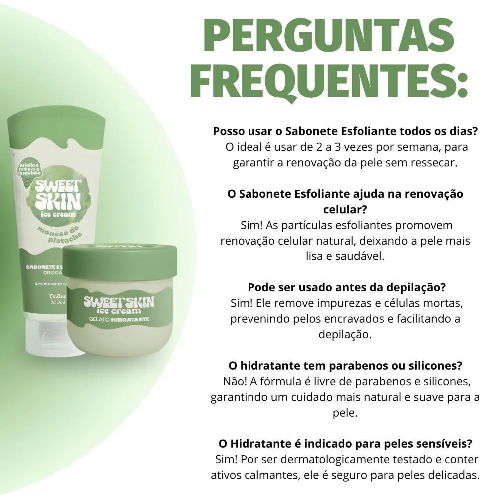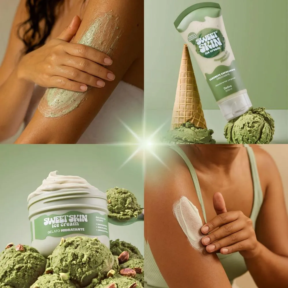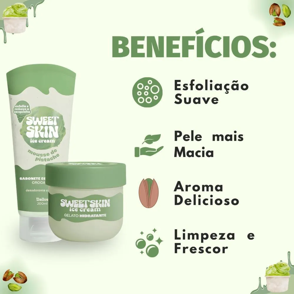 O Kit Contém: - 1 Sabonete Esfoliante Crocante Sweet Skin Ice Cream Mousse De Pistache 200ml - 1 Gelato Hidratante Corporal Sweet Skin Ice Cream Mousse De Pistache 200ml