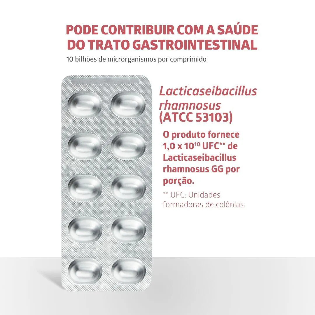 Cada comprimido contém 10 bilhões de UCF (Unidades Formadoras de Colônia) de Lactobacillus rhamnosus GG (LGG®).