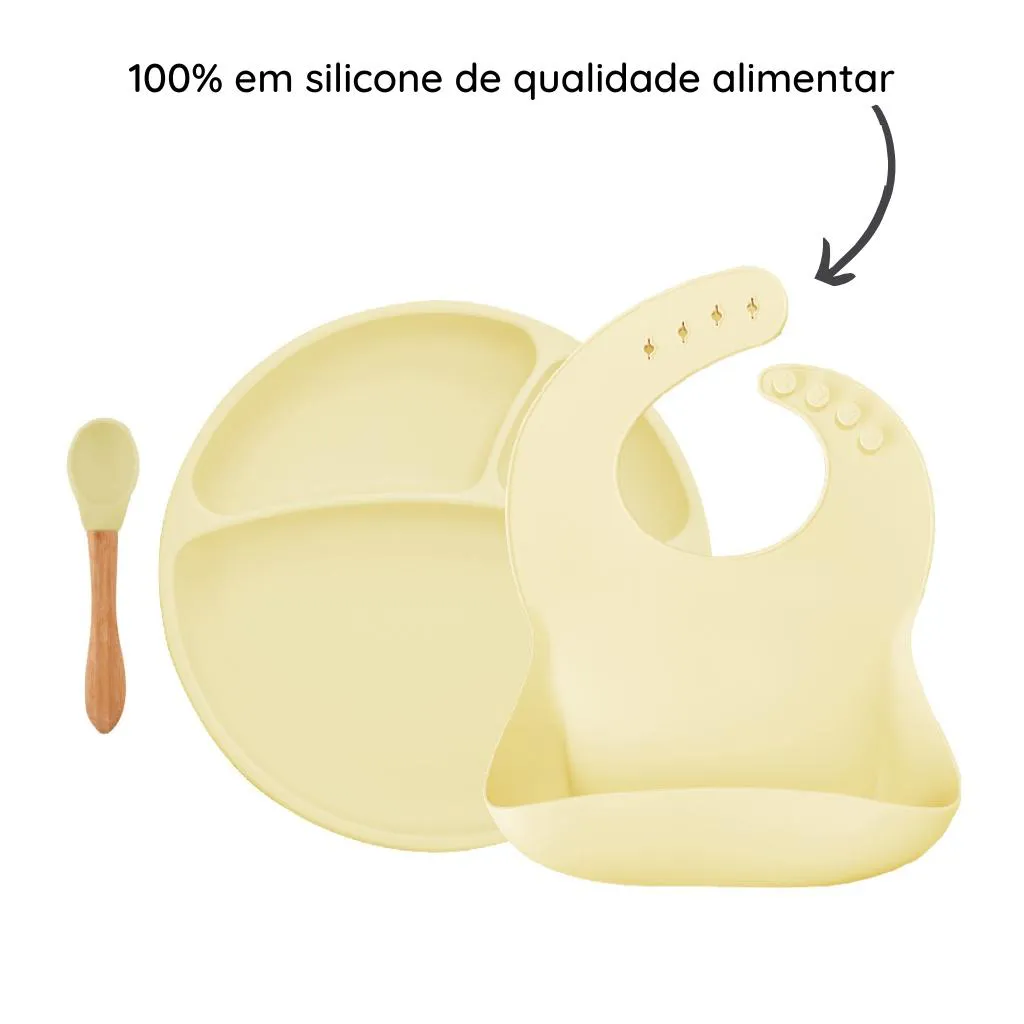 Atenção: O kit acompanha apenas 1 prato, 1 colher e 1 babador. Outros utensílios ilustrativos não estão inclusos.