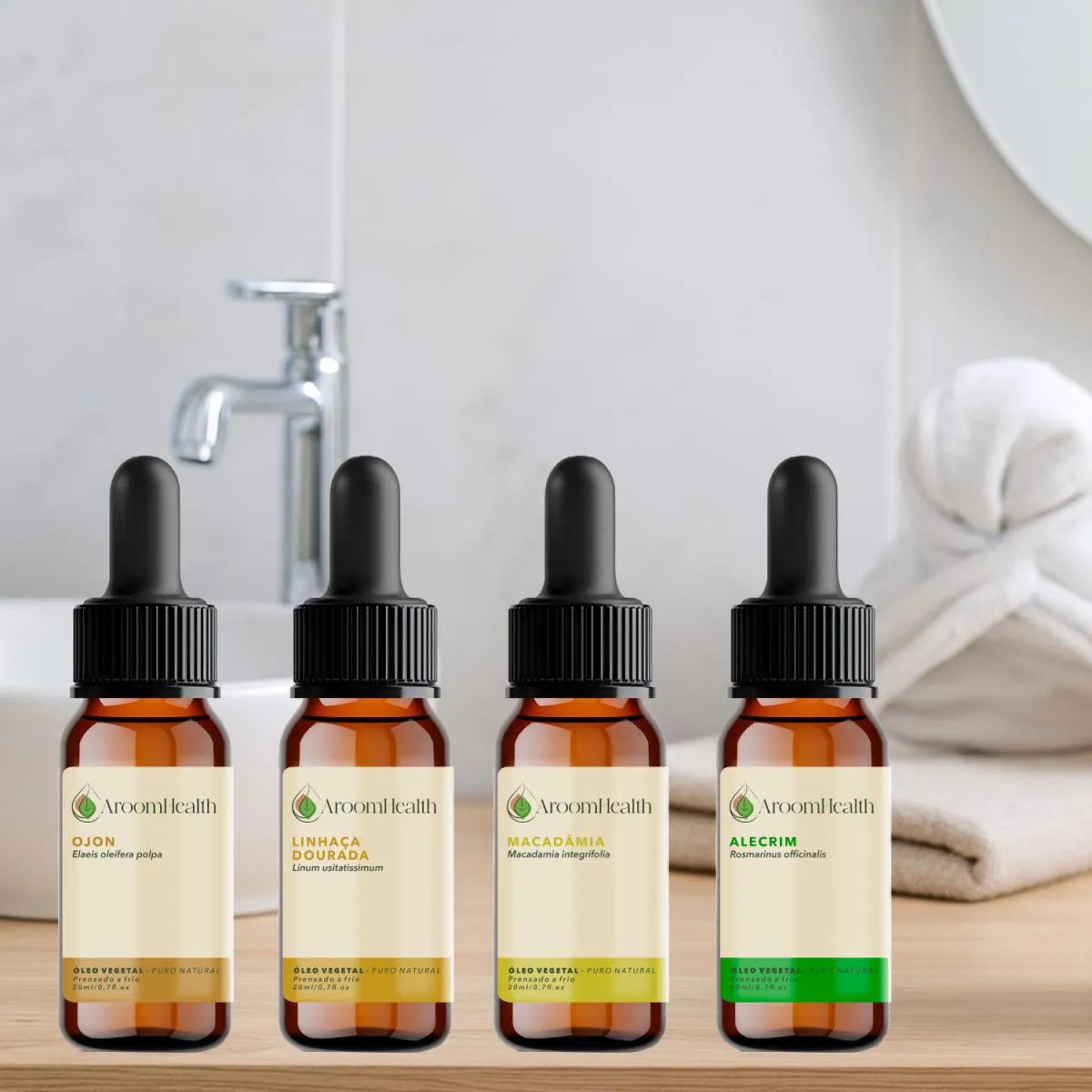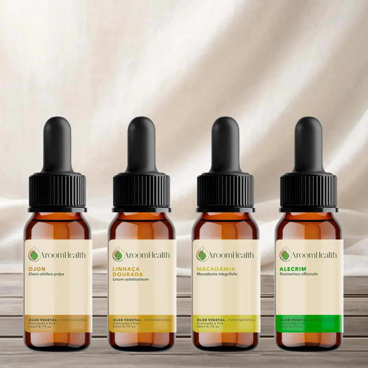 Kit de Óleos Vegetais Puro Natural – Ojon Polpa, Linhaça Dourada, Macadâmia e Alecrim – 20 ml cada | AroomHealth Eleve sua rotina de autocuidado com o Kit de Óleos Vegetais AroomHealth, formulado com óleos 100% puros, naturais e prensados a frio de Ojon Polpa, Linhaça Dourada, Macadâmia e Alecrim.