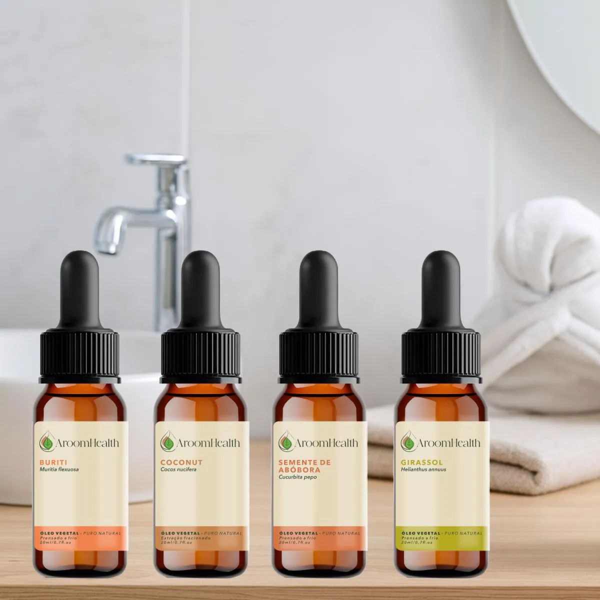 Kit de Óleos Vegetais Puro Natural – Coconut, Girassol, Semente de Abóbora e Buriti – 20 ml cada | AroomHealth Eleve sua rotina de cuidados com o Kit de Óleos Vegetais AroomHealth, formulado com óleos 100% puros, naturais e prensados a frio de Coconut, Girassol, Semente de Abóbora e Buriti.