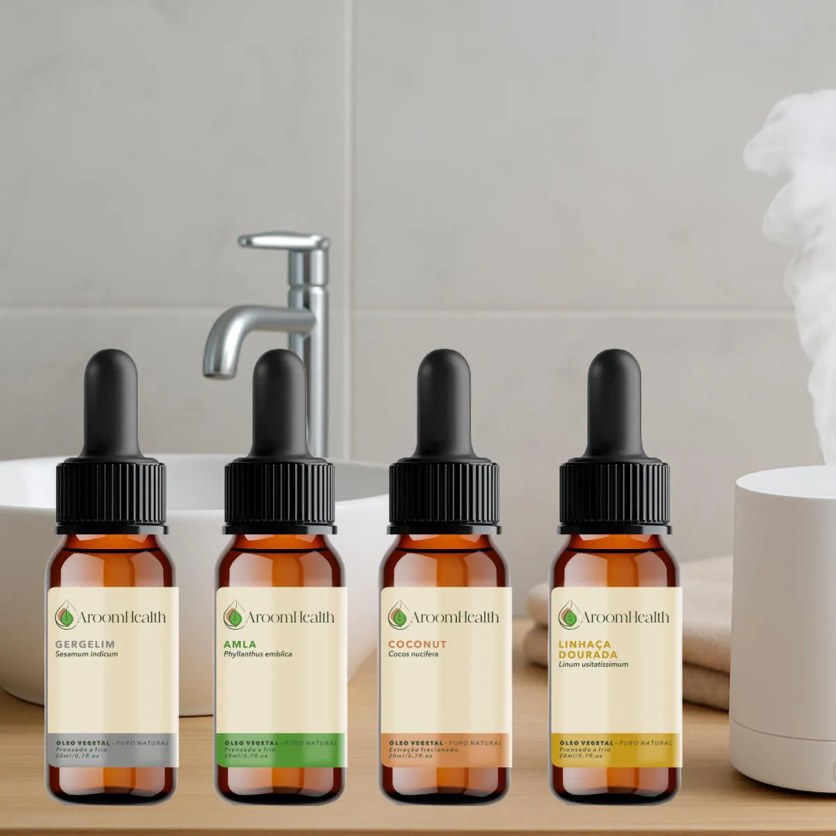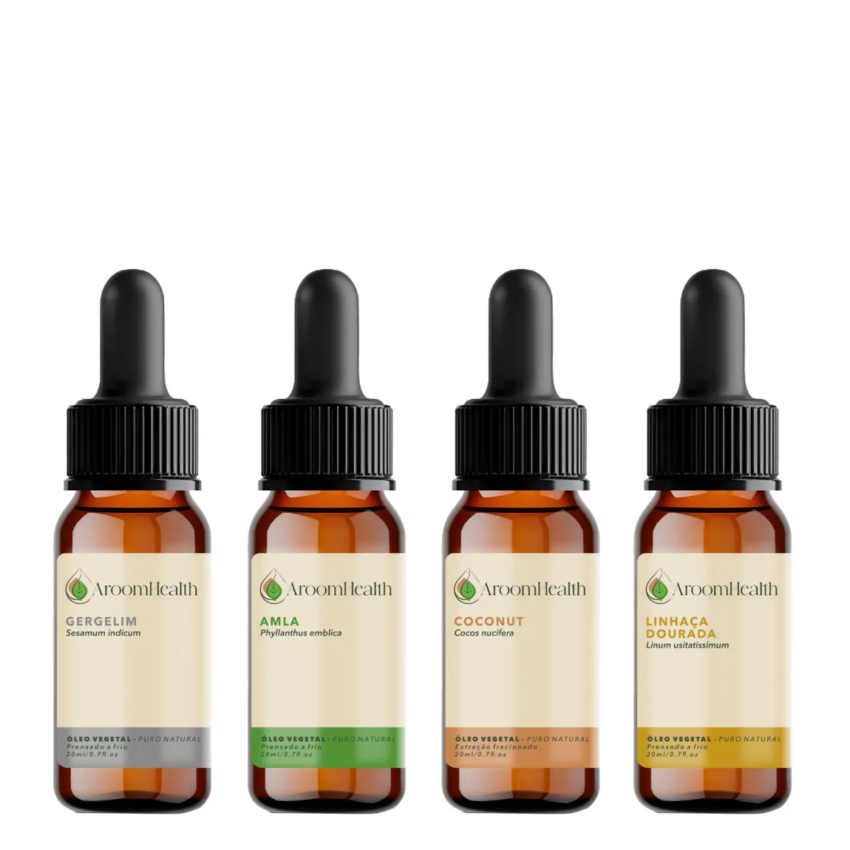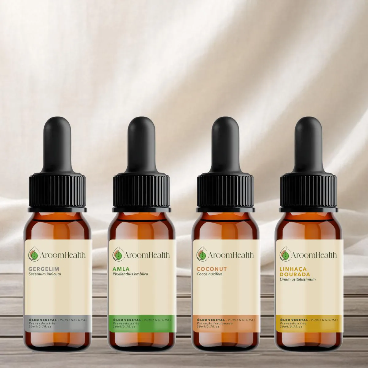 Kit de Óleos Vegetais Puro Natural – Gergelim, Amla, Coconut e Linhaça Dourada – 20 ml cada | AroomHealth Eleve sua rotina de beleza com o Kit de Óleos Vegetais AroomHealth, desenvolvido com óleos 100% puros, naturais e prensados a frio de Gergelim, Amla, Coconut e Linhaça Dourada.