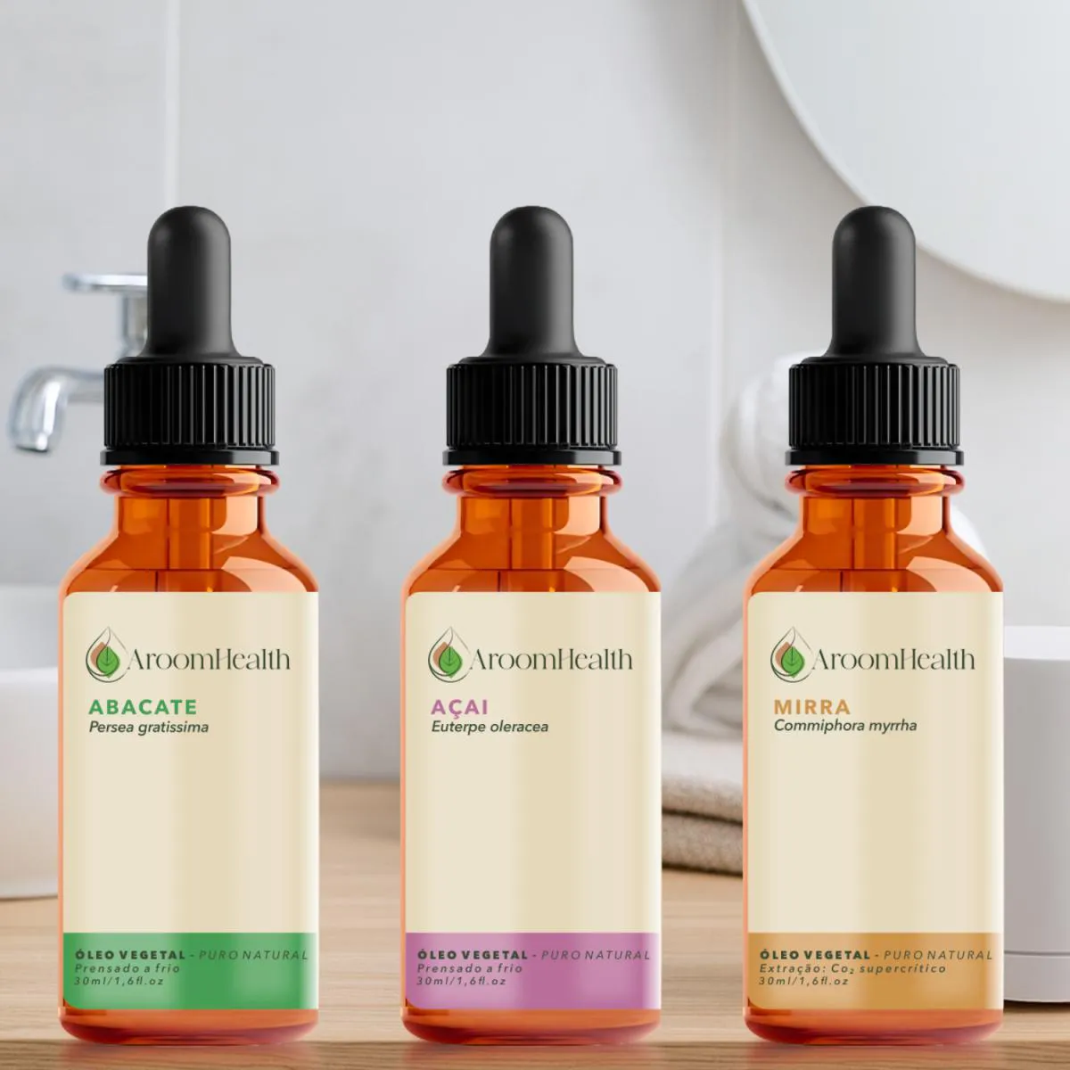 Kit de Óleos Vegetais Puro Natural – Mirra , Abacate e Açaí – 30 ml cada | AroomHealth Eleve seus cuidados com o Kit de Óleos Vegetais AroomHealth, formulado com óleos puros, naturais e prensados a frio de Mirra , Abacate e Açaí.