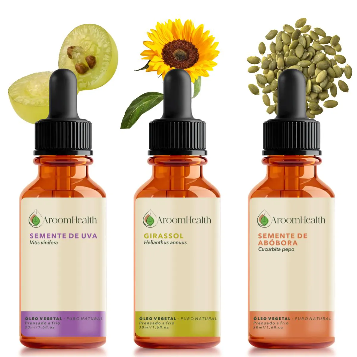Kit de Óleos Vegetais Puro Natural – Semente de Uva, Semente de Abóbora e Girassol – 30 ml cada | AroomHealth Eleve seus cuidados diários com o Kit de Óleos Vegetais AroomHealth, formulado com óleos 100% puros, naturais e prensados a frio de Semente de Uva, Semente de Abóbora e Girassol.