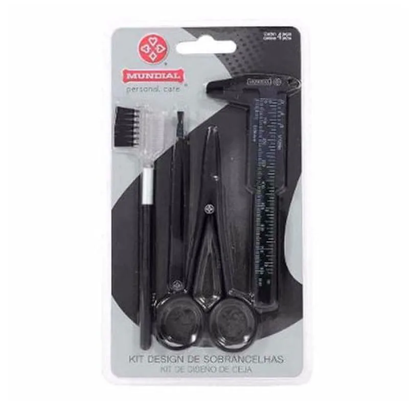 No Kit Design para Sobrancelhas BC-320 da marca Mundial estão presente os seguintes itens, paquímetro pequeno para medir sobrancelhas e seus ângulos, escova de pelos para organizar os fios, tesoura para aparar os pelos e por último uma pinça.