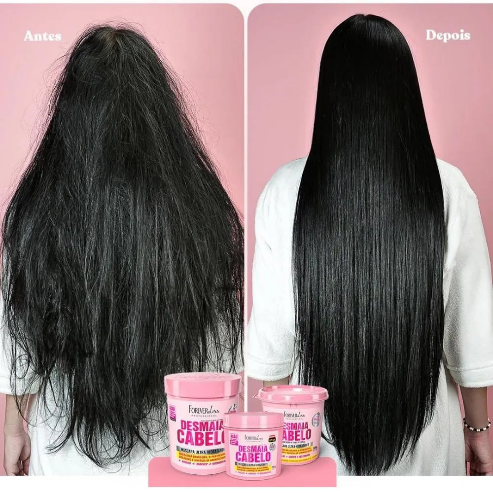 O kit desmaia cabelo da forever liss foi desenvolvido para hidratar instantaneamente os fios, combatendo o frizz e volume, alinhando os cabelos, deixando, os super macios, hidratados e sedoSOS. O shampoo desmaia cabelo ultra hidratante com ação instantnea para reduzir o volume e o frizz, além de limpar e reparar suavizando os fios, deixa, os com muito mais brilho, macios e mais sedoSOS.