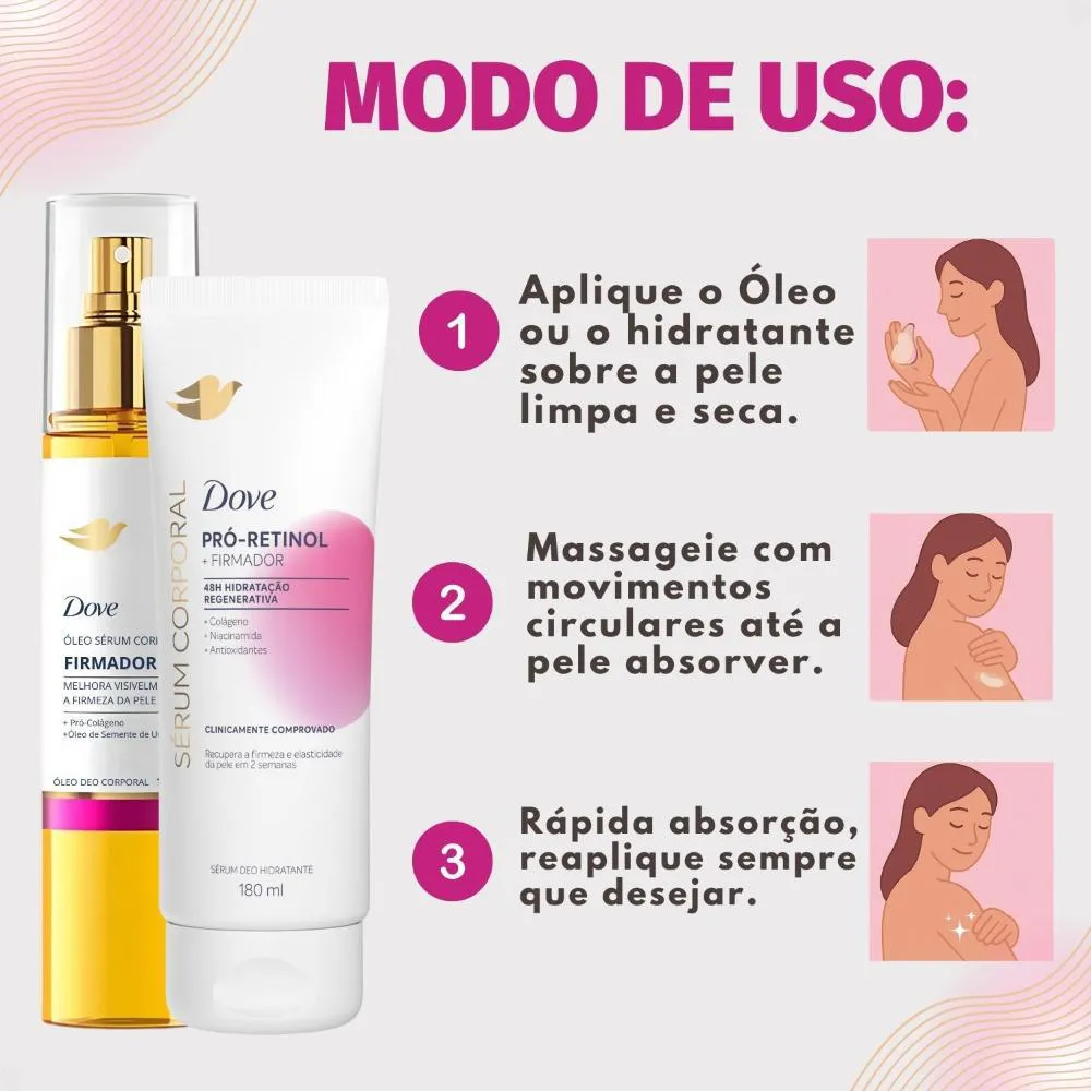 Para obter os melhores resultados com o Kit Dove Firmador Pró-Retinol, siga estas instruções:Aplique o Sérum Deo Hidratante e o Óleo Sérum Deo Corporal diariamente em todo o corpo.Utilize como uma opção ao seu creme corporal tradicional para manter a pele hidratada, perfumada e ajudar a promover o equilíbrio do microbioma da pele.Massageie suavemente até completa absorção, aproveitando a textura leve e de rápida absorção.Anvisa Óleo Sérum: 25351.084753/2025-77 Anvisa Sérum Deo Hidratante: 25351.953885/2024-78