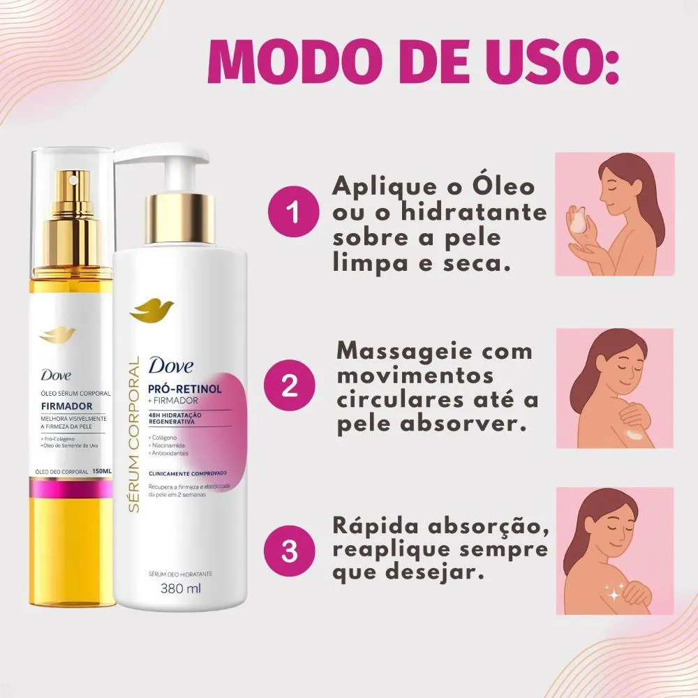 Para obter os melhores resultados com o Kit Dove Firmador Pró-Retinol, siga estas instruções:Aplique o Sérum Deo Hidratante e o Óleo Sérum Deo Corporal diariamente em todo o corpo.Utilize como uma opção ao seu creme corporal tradicional para manter a pele hidratada, perfumada e ajudar a promover o equilíbrio do microbioma da pele.Massageie suavemente até completa absorção, aproveitando a textura leve e de rápida absorção.Anvisa Óleo Sérum: 25351.084753/2025-77 Anvisa Sérum Deo Hidratante: 25351.953885/2024-78