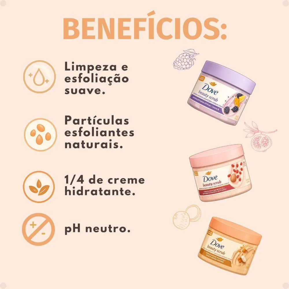 Formulação exclusiva com ¼ de creme hidratante, nutrindo a pele enquanto esfolia.Contém partículas esfoliantes de origem natural, garantindo uma esfoliação suave e eficaz.Com pH neutro e 0% sulfato, ideal para todos os tipos de pele, inclusive as mais sensíveis.Produto Cruelty-Free, certificado pela PETA, reforçando o compromisso com a ética.Kit completo com três fragrâncias distintas: Amora e Frutas Cítricas, Romã e Manteiga de Karité, e Coco e Açúcar Mascavo.