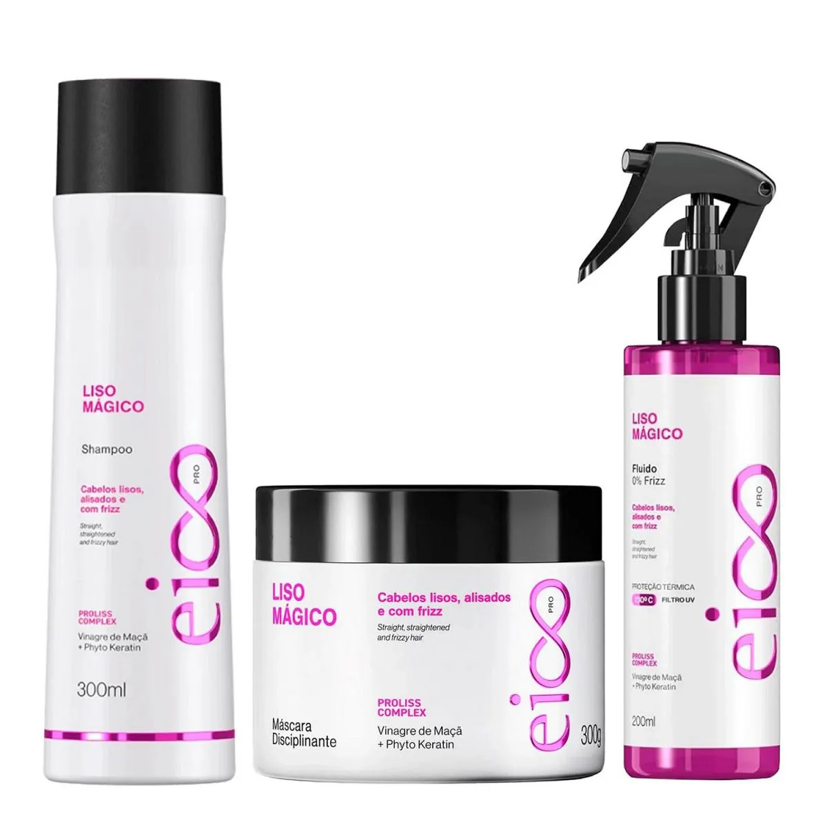O Trio Essencial para um Liso Perfeito e Protegido: Eico Pro Liso Mágico - shampoo 300ml + máscara 300g + Fluido Termoativado 200ml