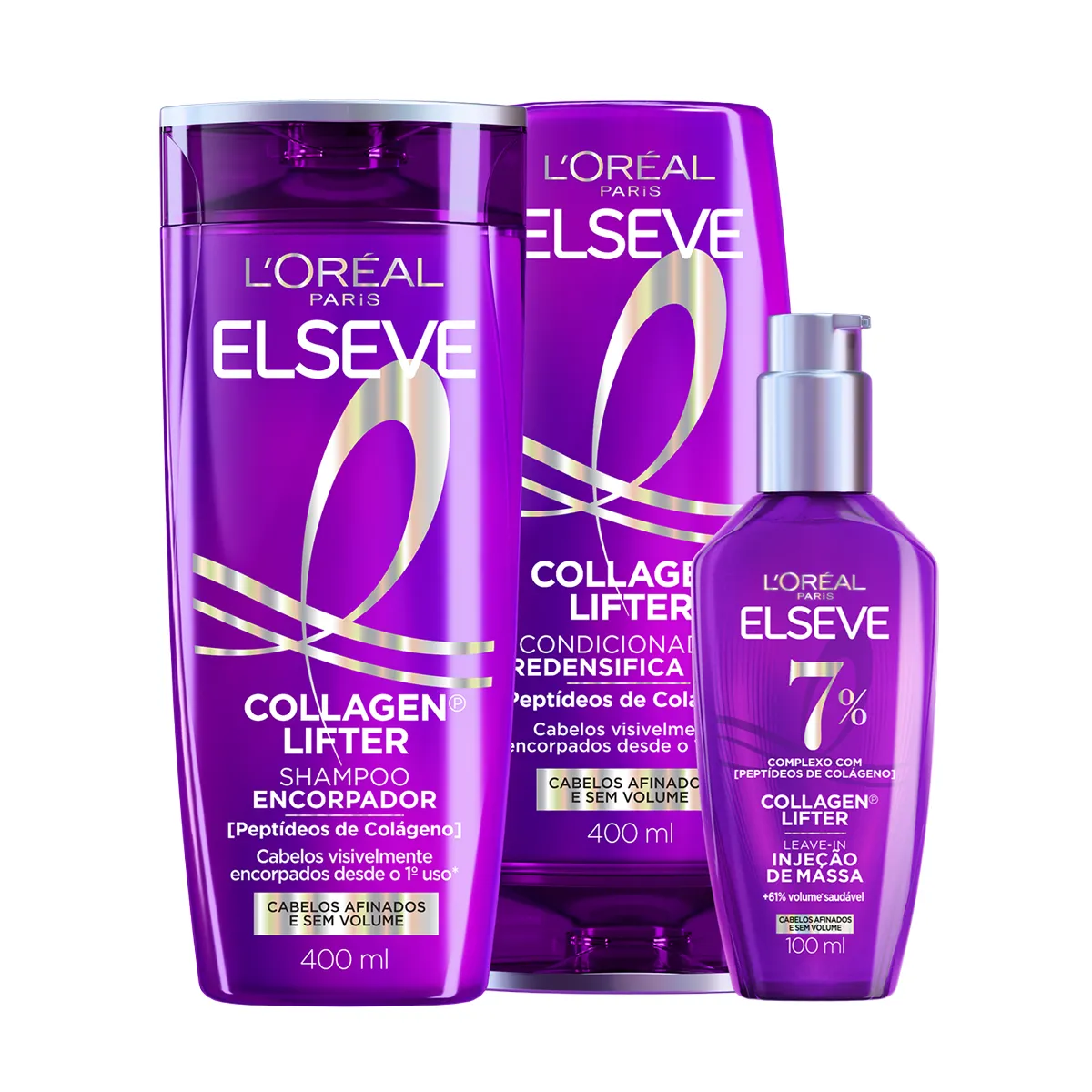O Kit Elseve Collagen Lifter Shampoo + Condicionador + Leave-in é um conjunto de produtos desenvolvidos para cabelos finos, afinados e sem volume, que necessitam de encorpamento, densidade e aumento imediato da espessura dos fios. A fórmula do Shampoo Encorpador contém um complexo exclusivo com peptídeos de colágeno vegetais, capazes de mimetizar os peptídeos naturalmente presentes no colágeno, ajudando a reconstruir massa capilar enquanto amplia o volume das raízes às pontas. O Condicionador Redensifica Fios é enriquecido com o mesmo complexo de peptídeos de colágeno vegetais, promovendo fios visivelmente mais cheios, soltos e com volume duradouro. Já o Leave-in Injeção de Massa, com 7% desse complexo exclusivo, reconstrói massa capilar e proporciona mais densidade desde o primeiro uso, deixando o cabelo encorpado, leve e com volume prolongado.