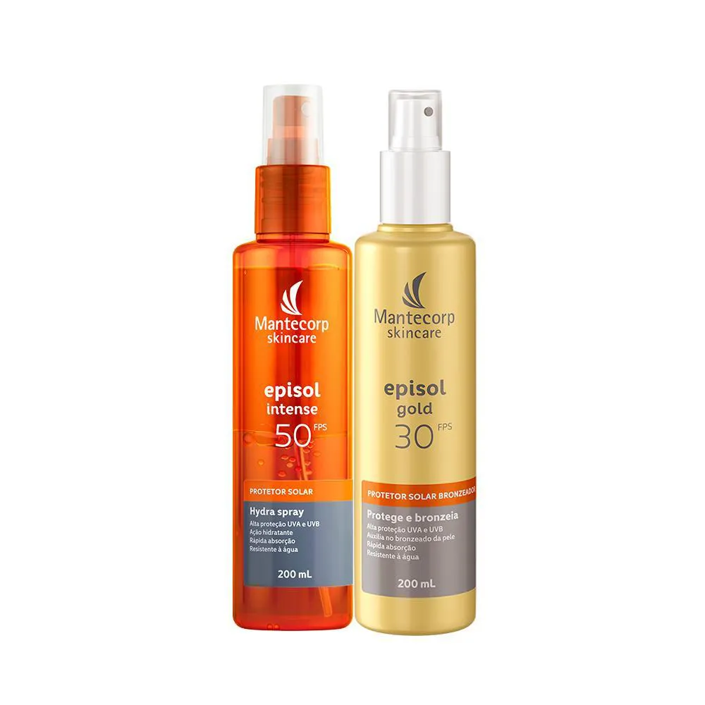 Produtos inclusos no kit: protetor solar Corporal Bifásico Episol Intense Hydra FPS 50 | Spray - 200ml e Protetor Solar e Bronzeador Corporal Episol Gold FPS 30 - 200ml