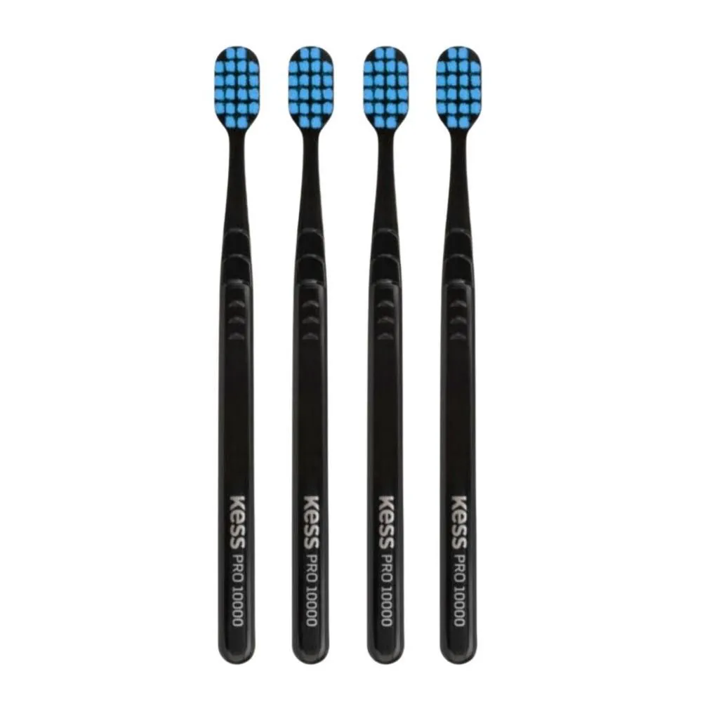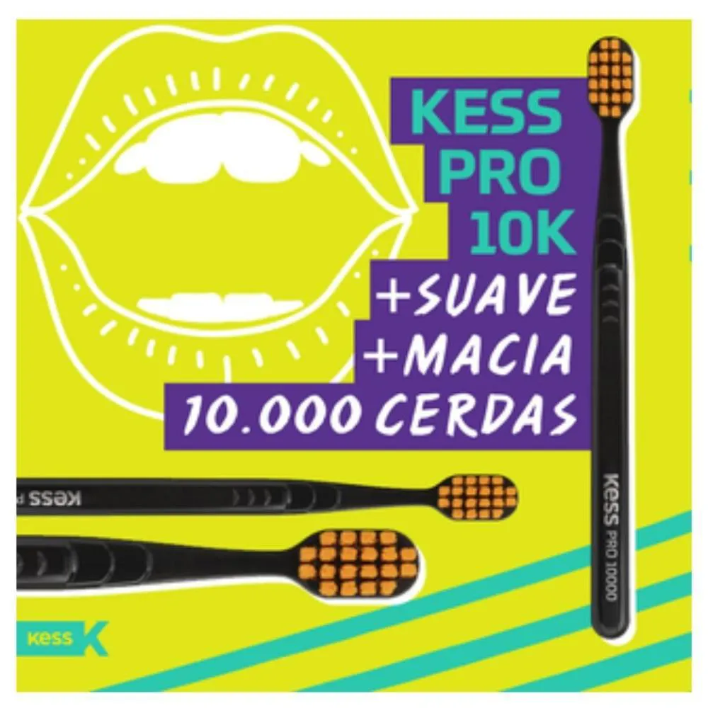 Contém: -4 Escovas kess pro 10K . Escova Dental Kess Pro 10K Extra Macia Características 10.000 cerdas extra macias e ultrafinas de material especial que oferecem mais conforto na escovação, são gentis com a gengiva e garantem limpeza profunda dos dentes. Cabo reto com cabeça angulada. Capa protetora de cerdas. . Função Escova dental com cerdas feitas de um material diferenciado, importado da Alemanha, que é tão fino quanto um fio de cabelo! Por isso, são ainda mais macias que as tradicionais, que tem cerdas de nylon. E o resultado disso é LIMPEZA EFICIENTE e CONFORTÁVEL! Devido a quantidade e a espessura das cerdas, as escovas da linha Kess Pro atingem áreas inacessíveis às escovas comuns. As cerdas especiais ainda conseguem neutralizar a força excessiva durante a escovação, agredindo menos as gengivas. . Diferencial Exclusiva no mercado, vem com 10.000 cerdas. 10X mais cerdas que uma escova tradicional! O resultado garante uma experiência de uso única: uma escovação super confortável e eficiente!