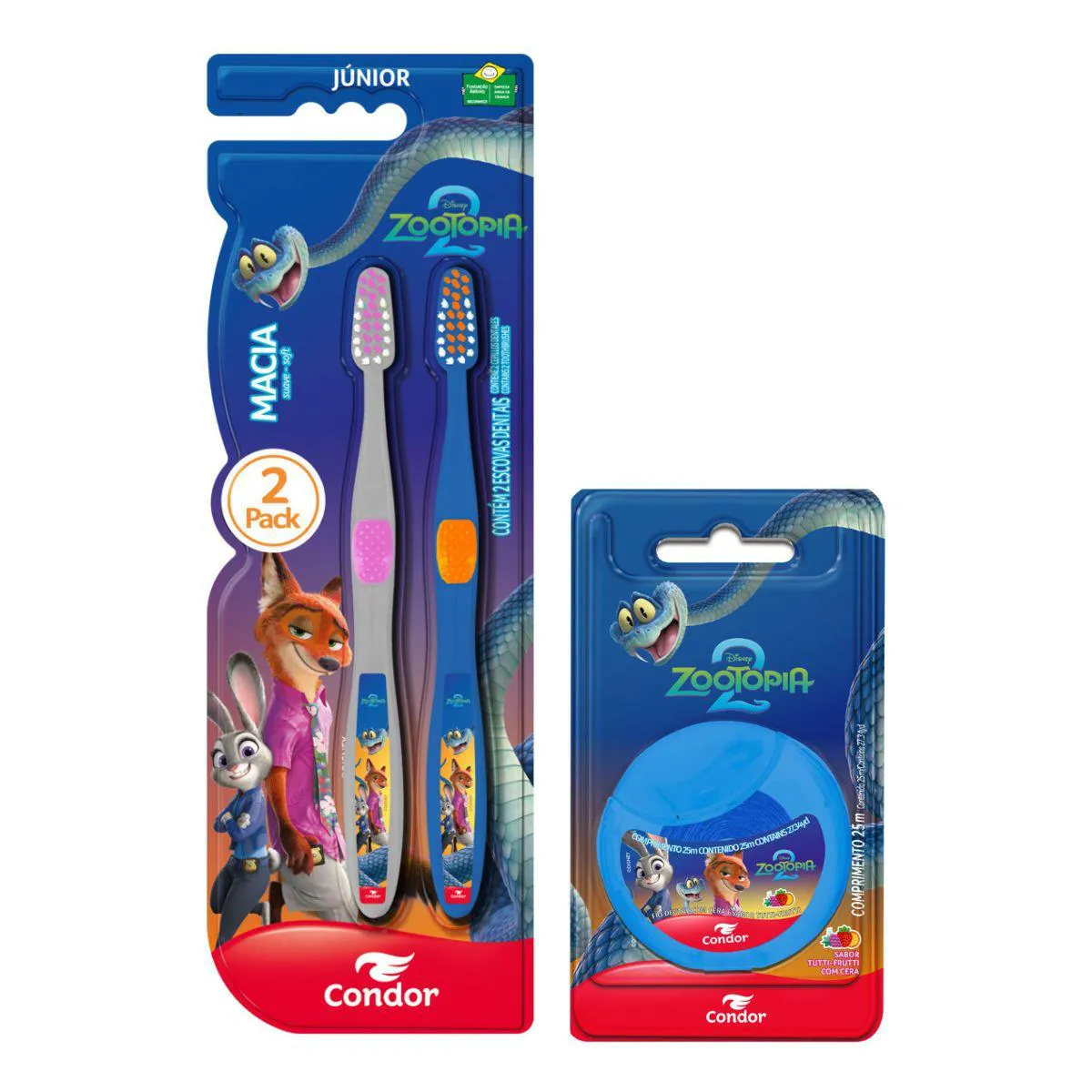 Agora, a diversão do filme Zootopia também invade a rotina das crianças!A Escova Dental infantil Macia Zootopia 2 Condor Júnior Cabeça P 2 Unidades deixa a escovação mais divertida, colorida e cheia de imaginação. Com cerdas macias que limpam sem agredir a gengiva e cabeça pequena que alcança até os dentes do fundo, é ideal para crianças. Seu cabo ergonômico emborrachado garante mais segurança e firmeza na hora da escovação.O fio dental com Cera Tutti-Frutti Zootopia 2 Condor 25m é macio, resistente e com deslizamento suave entre os dentes, removendo a placa onde a escova não alcança, ajudando a prevenir cáries e mau hálito. Tudo isso com o delicioso sabor Tutti-Frutti que as crianças adoram!