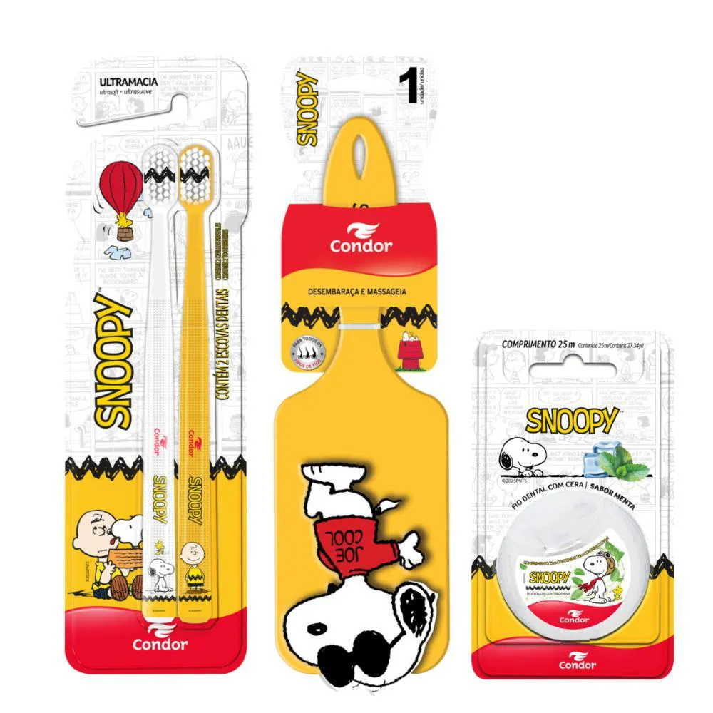 Kit Escova Dental Ultramacia + Escova Raquete + Fio Dental Snoopy e transforme sua rotina de cuidados bucais em um momento especial. Seu sorriso merece esse cuidado!