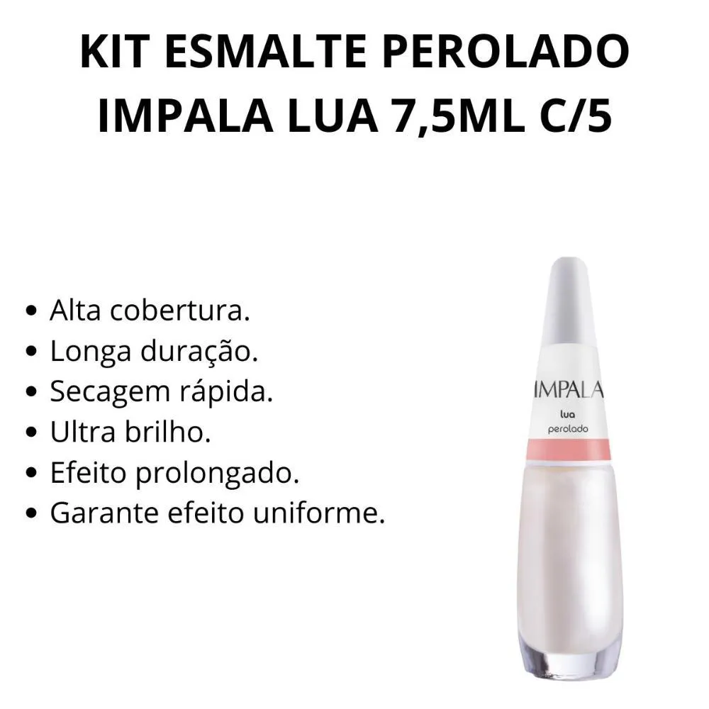 Contém: - 05 esmaltes Perolados Impala Lua 7,5ml. . Esmalte Perolado Lua Qual a sua lista de coisas mais lindas do mundo? Com certeza a lua está nela! Um brilho surreal e beleza estonteante, um tom branco perolado que transmite leveza e paz, o esmalte Lua é perfeito para produções leves e delicadas. . Modo de Uso Agite bem antes de usar, aplique o esmalte sobre as unhas, aguarde a secagem e reaplique se necessário.