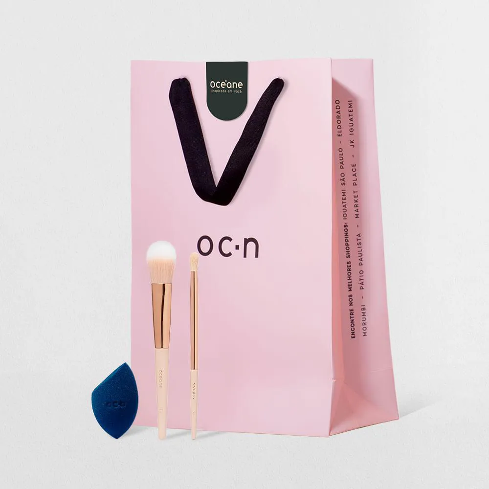 O Kit Esponja de Maquiagem Azul + Pincel para Blush Ocn3 + Pincel para Sombra Ocn8 + Sacola de Presente Média Contém: