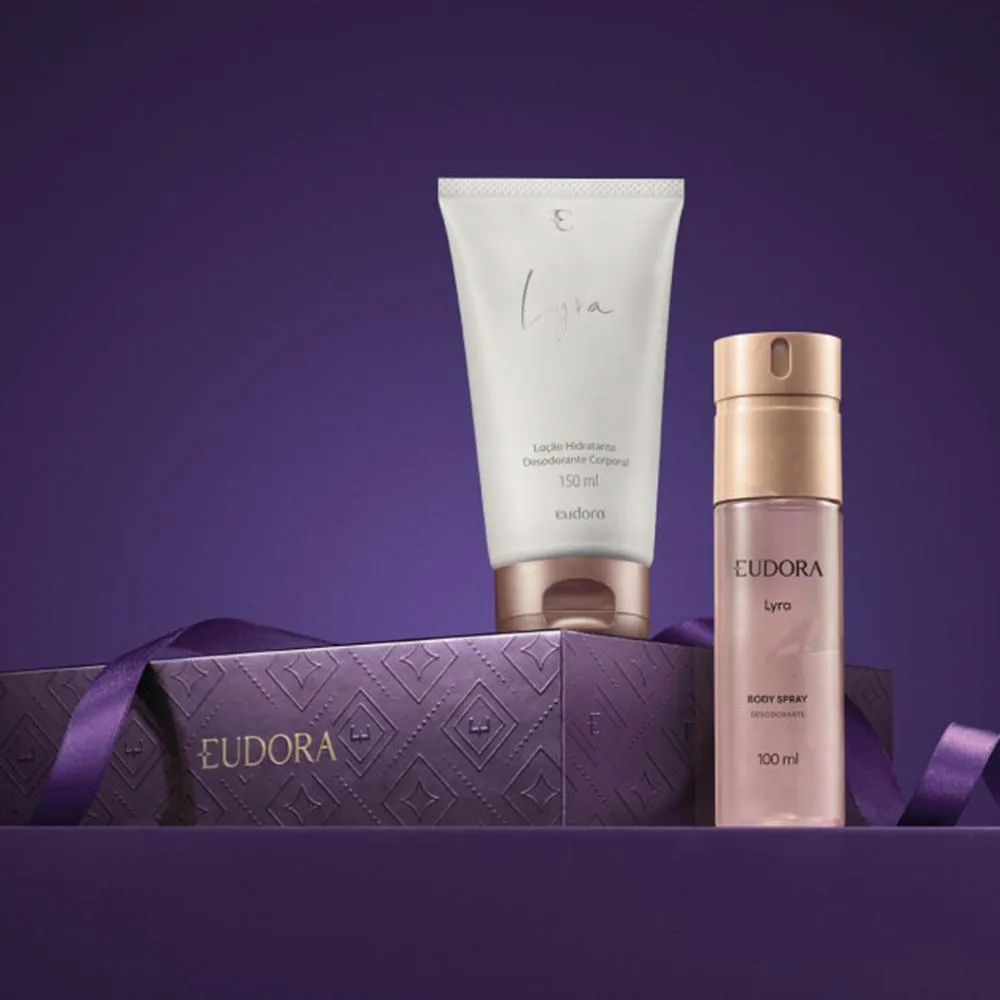 Presenteie com o Kit Lyra Mães para criar lembranças inesquecíveis. O Body Spray Desodorante Lyra, com sua fragrância Oriental floral, proporciona uma perfumação exuberante e suave, deixando a pele radiante e perfumada por horas, podendo ser utilizado no corpo todo, inclusive nas axilas. A Loção Hidratante Desodorante Corporal Lyra, possui fórmula de rápida absorção, proporcionando toque macio e hidratando profundamente a pele por até 48h. Sua fragrância Oriental Floral vai te deixar exalando brilho, com uma perfumação suave e inconfundível. O Estojo contém: 01 Body Spray Desodorante Lyra 100ml 01 Loção Hidratante Desodorante Corporal Lyra 150ml Eudora é uma marca que se propõe a fazer parte da sua vida com um amplo portfólio de cosméticos para atender as necessidades de quem deseja ser protagonista de suas próprias vidas. A marca desenvolve perfumaria, maquiagem, produtos para cabelo, corpo, banho, esmaltes e acessórios. Tudo isso para oferecer presentes e soluções acessíveis para os cuidados diários de quem os merece: Você. Nenhum produto Eudora é testado em animais, ou seja, este item possui selo Cruelty Free.