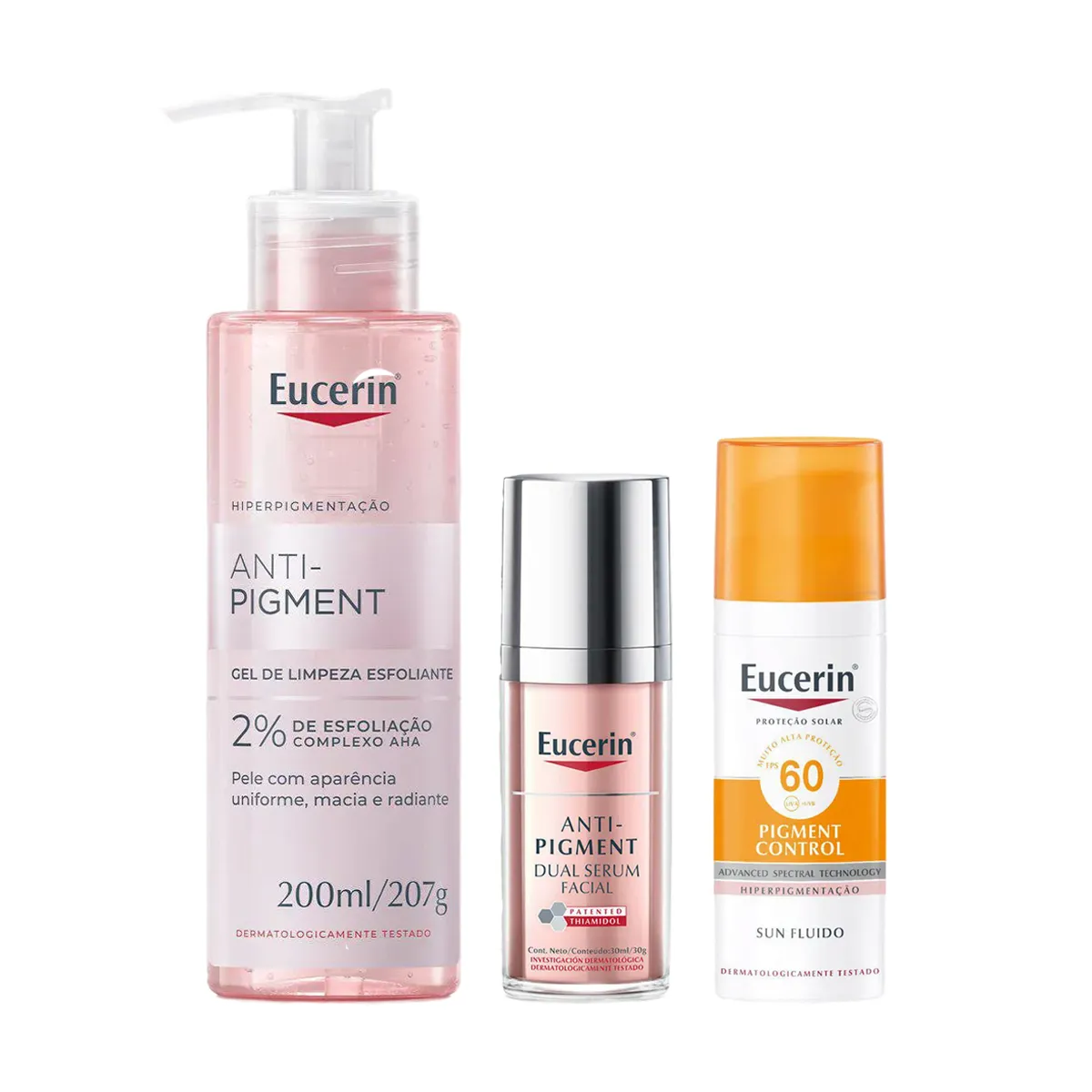 Kit Facial Eucerin Anti-Pigment Gel de Limpeza Esfoliante 200ml + Sérum Clareador 30ml + Protetor Solar Control FPS 60 50ml