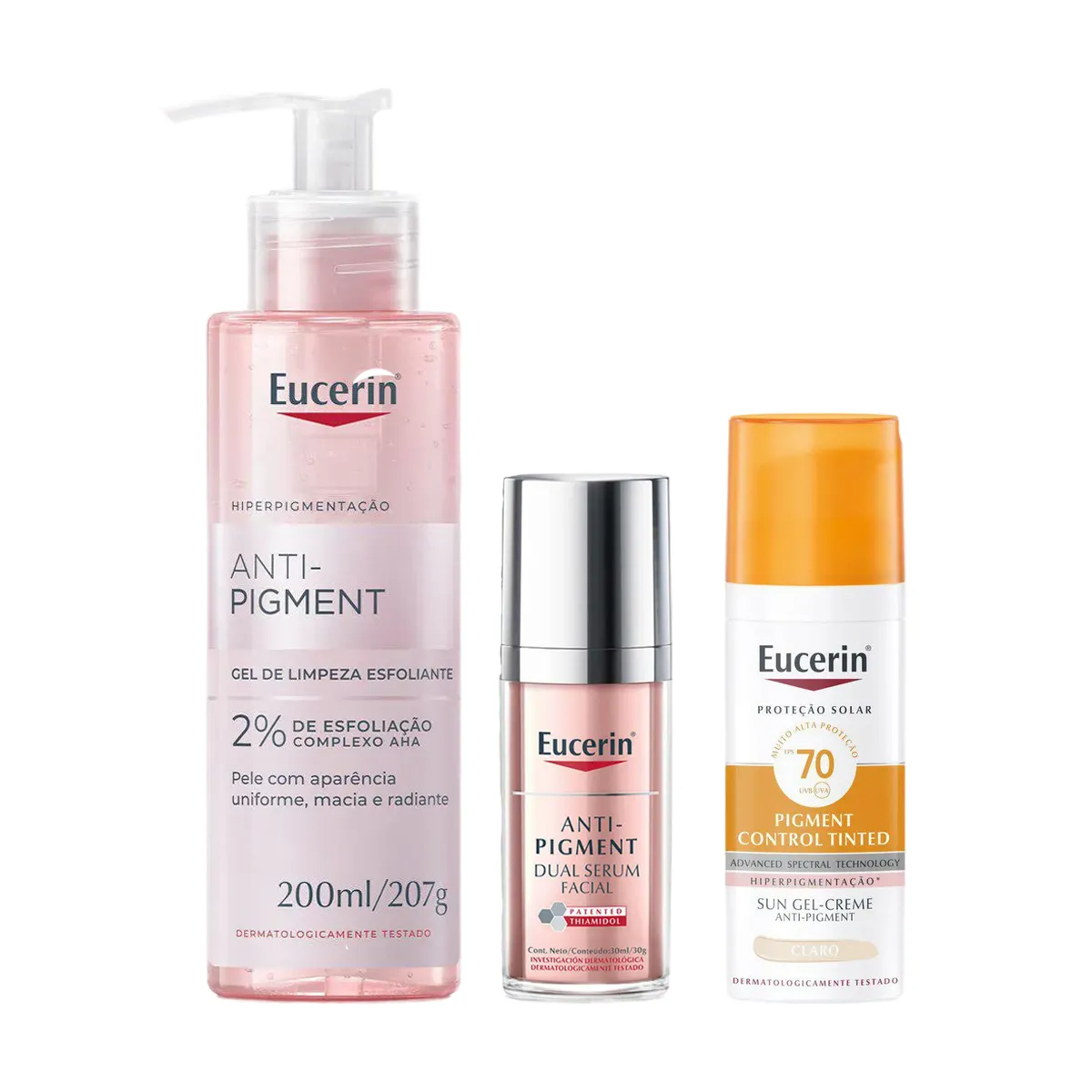 Kit Facial Eucerin Anti-Pigment Gel de Limpeza Esfoliante 200ml + Sérum Clareador 30ml + Protetor Solar Control Tinted FPS 70 Claro 50ml