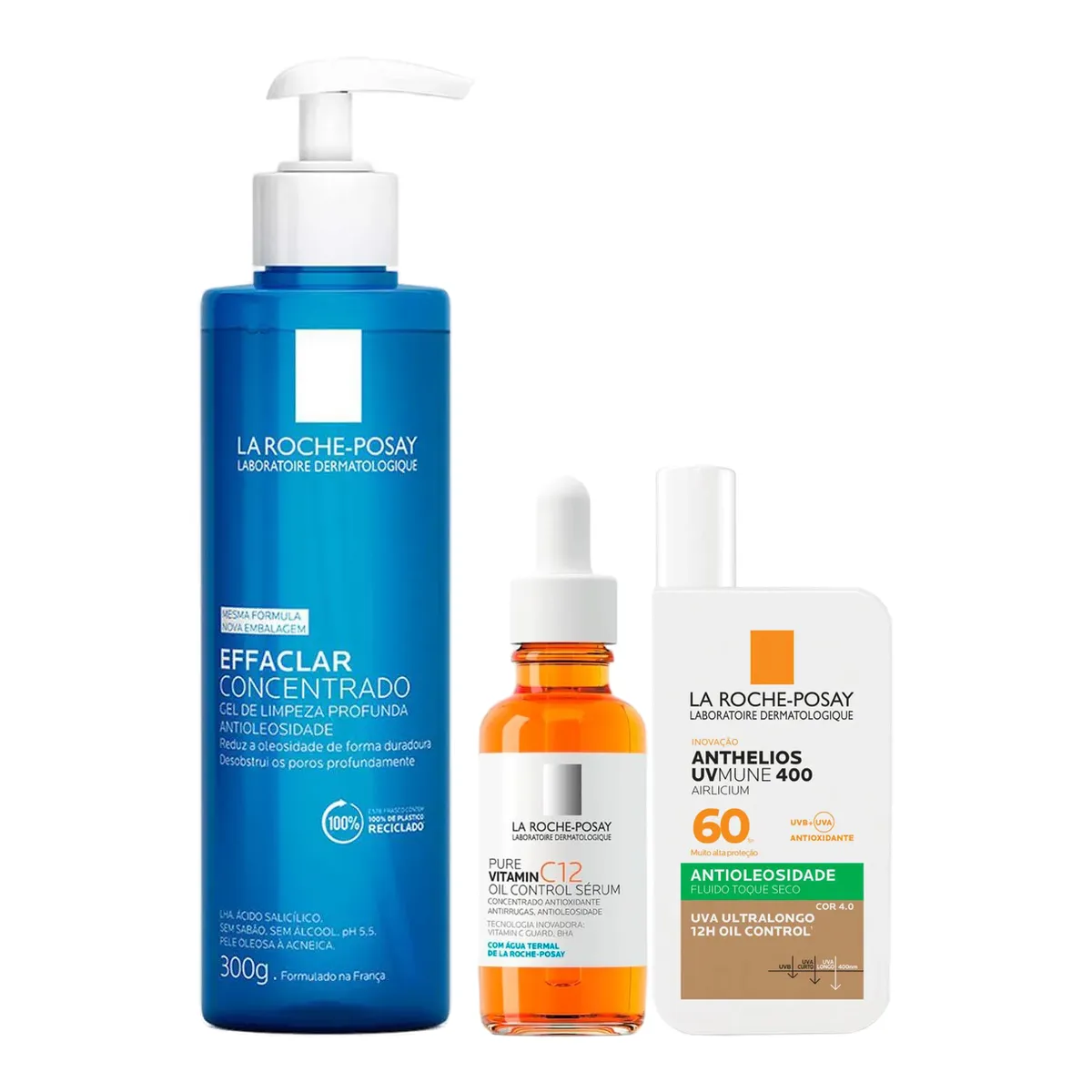 O Kit Facial La Roche-Posay Gel de Limpeza Concentrado Effaclar para Pele Oleosa + Sérum Anti-Rugas Pure Vitamin C12 Oil Control + Protetor Solar Anthelios UVMune 400 Airlicium Antioleosidade FPS 60 Cor 4.0 é um conjunto de produtos desenvolvidos especialmente para peles oleosas e com tendência à acne. O Effaclar Concentrado é um gel de limpeza facial que realiza uma limpeza profunda e relaxante, reduzindo a oleosidade e desobstruindo os poros. O Sérum Pure Vitamin C12 Oil Control é um sérum facial antioxidante e antirrugas, com ácido salicílico para auxiliar no controle da oleosidade. Já o Anthelios UVMune 400 Airlicium é um protetor solar facial de muito alta proteção, com tecnologia para controle e redução da oleosidade.