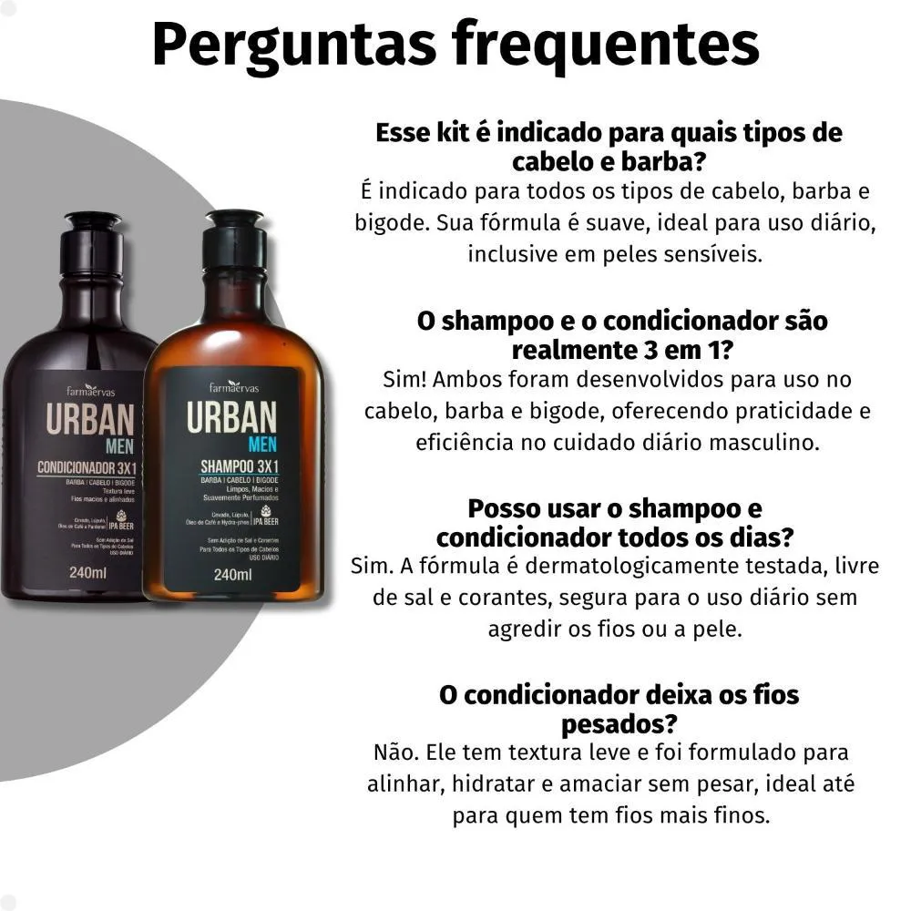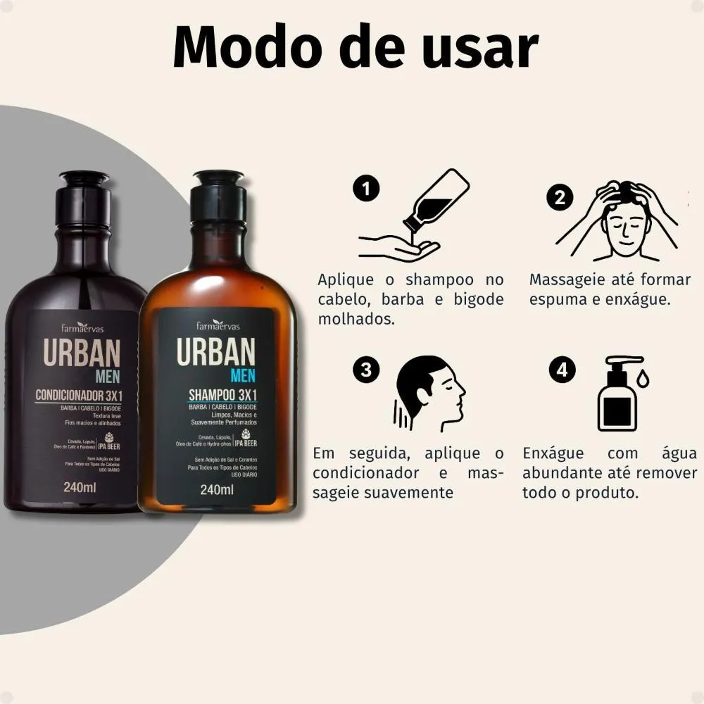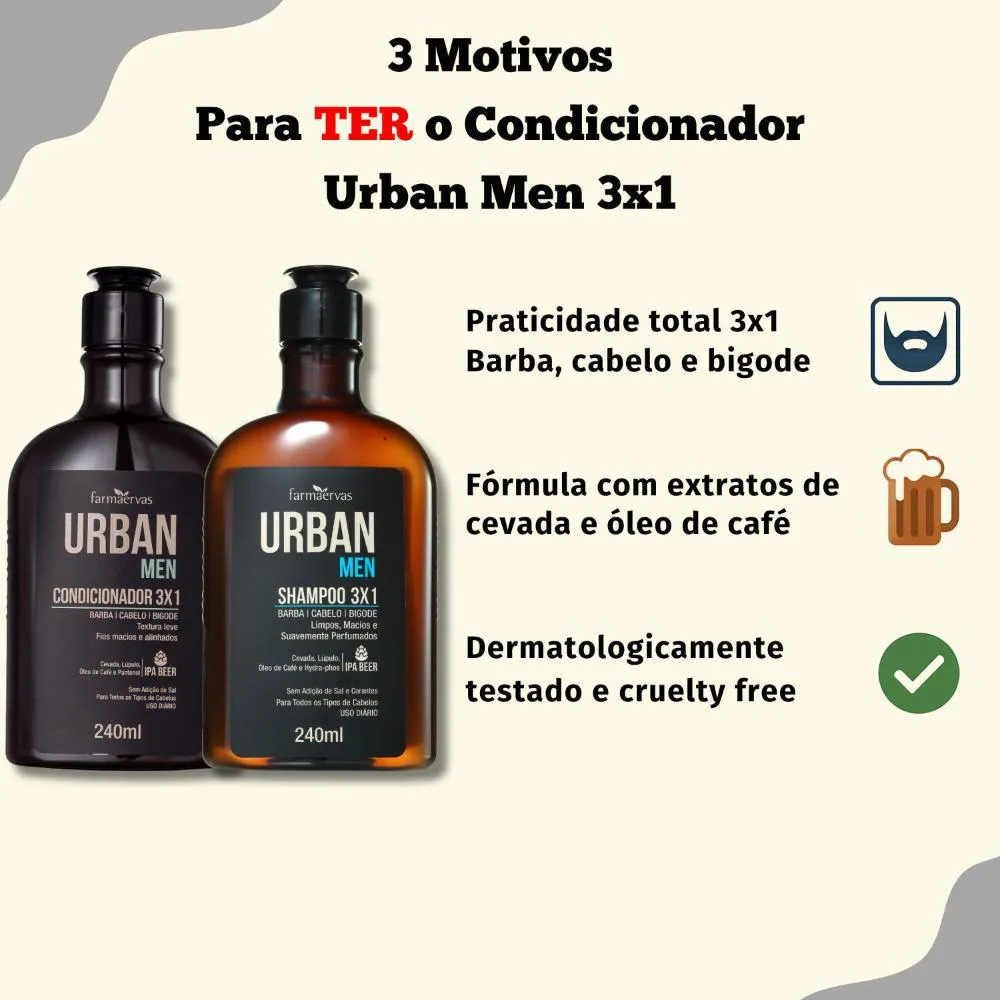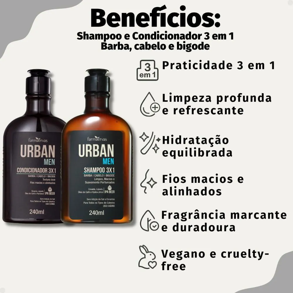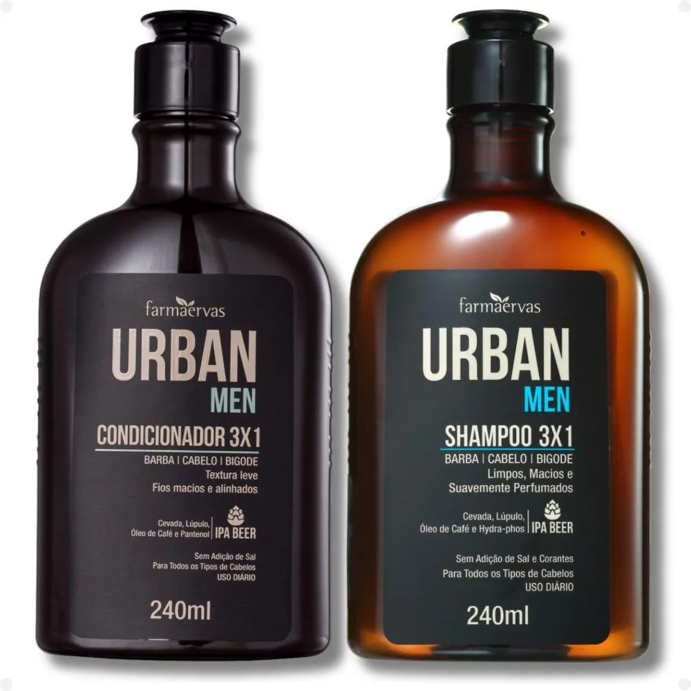 Kit Farmaervas Urban Men: Shampoo e Condicionador 3x1 240ml, a solução completa para os cuidados diários de barba,