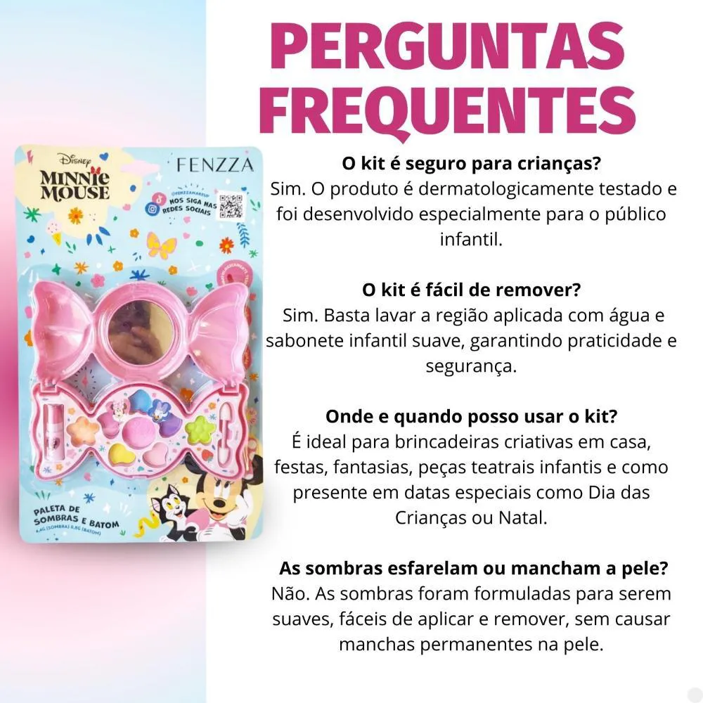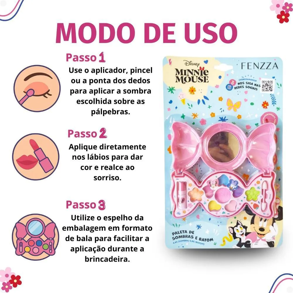 Produto licenciado Disney Minnie, com design exclusivo e encantador.Fórmula cruelty-free e dermatologicamente testada, garantindo segurança para a pele infantil.Paleta de sombras com 6 tonalidades e diversos acabamentos: matte, cintilante, glitter e acetinado.Batom com acabamento cremoso, proporcionando conforto e cor.Embalagem em formato de bala com espelhinho integrado, prática e colecionável.