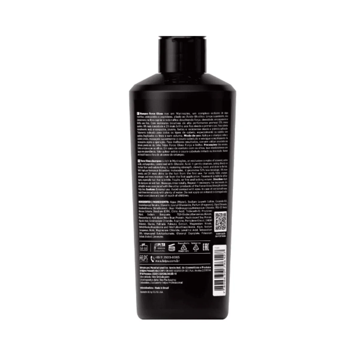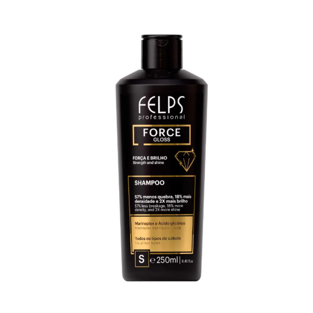 Kit Force Gloss ( Força e Brilho ) shampoo 250mL + condicionador 250mL Felps Professional Shampoo Force Gloss Felps Professional - 250mL Shampoo Force Gloss rico em Marineplex, um complexo exclusivo de algas marinhas, aminoácidos e peptídeos, aliado ao Ácido Glicólico. Limpa suavemente, atua diretamente na fibra capilar e redensifica devolvendo força, densidade, encorpamento e brilho aos fios. Com moléculas bioativas de alta performance promove 57% menos quebra, 18% mais densidade e 2X mais brilho aos fios desde o primeiro uso. Para cabelos visivelmente mais encorpados, jovens, fortes e resistentes desde a primeira aplicação. Tratamento indicado para todos os tipos de cabelo, especialmente os cabelos com quebra, fragilizados ou finos e sem volume. Modo de Uso: Aplique o shampoo sobre o cabelo úmido, massageie suavemente o coura cabeludo e enxágue completamente. Se necessário, repita a operacao. Composição: Aqua (Water), Sodium Laureth Sulfate, Cocamide DEA, Cocamidopropyl Betaine, Glycerin, Lauryl Glucoside, Parfum (Fragrance), Glycol Distearate, Amodimethicone, Dimethiconol, Guar Hydroxypropyltrimonium Chloride, PEG-120 Methyl Glucose Dioleate, Disodium EDTA, Citric Acid, Trideceth-12, Propylene Glycol, Sodium Benzoate, TEA-Dodecylbenzenesulfonate, Phenoxyethanol, Hydrolyzed Rice Bran Protein, Hydrolyzed Soy Protein, Glycolic Acid, Cetrimonium Chloride, Arginine, Pentylene Glycol, DMDM Hydantoin, Glycine, Palmaria Palmata Extract, Magnesium Nitrate, Methylchloroisothiazolinone and Methylisothiazolinone, Algin, Sodium Carrageenan, Biotin, Magnesium Chloride, Levulinic Acid, Tetrasodium EDTA, Iodopropynyl Butylcarbanate, Glyceryl Caprylate, Potassium Sorbate, Linalool, Limonene. Condiocionador Force Gloss Felps Professional – 250mL Condicionador Force Gloss rico em Marineplex, um complexo exclusivo de algas marinhas, aminoácidos e peptídeos, aliado ao Ácido Glicólico e ao nutritivo Óleo de Crambe. Condiciona, sela as cutículas e redensifica, devolvendo força, densidade e brilho aos fios. Com moléculas bioativas de alta performance promove 57% menos quebra, 18% mais densidade e 2X mais brilho aos fios desde o primeiro uso. Para cabelos visivelmente mais encorpados, jovens, fortes e resistentes desde a primeira aplicação. Tratamento indicado para cabelos com quebra, fragilizados e finos. Modo de Uso: Aplique o condicionador após o uso do shampoo ou máscara, massageando o comprimento dos fios e enxágue completamente. Composição: Aqua (Water), Cetearyl Alcohol, Glycerin, Cetyl Alcohol, Elaies Guineenses Oil, Behentrimonium Chloride, Cetrimonium Chloride, Parfum (Fragrance), Stearamidopropyl Dimethylamine, Lactic Acid, Butyrospermum Parkii (Shea) Butter, Guar Hydroxypropyltrimonium Chloride, Isopropyl Alcohol, Alcohol, Cocos Nucifera (Coconut) Oil, Crambe Abyssinica Seed Oil, Polyquaternium-7, PEG-90M, Tocopheryl Acetate, Propylene Glycol, Hydrolyzed Rice Bran Protein, Hydrolyzed Soy Protein, Sodium Benzoate, Disodium EDTA, Glycolic Acid, Arginine, Pentylene Glycol, Glycine, Palmaria Palmata Extract, Phenoxyethanol, Magnesium Nitrate, Algin, Methylchloroisothiazolinone and Methylisothiazolinone, Sodium Carrageenan, Biotin, Magnesium Chloride, Levulinic Acid, Tetrasodium EDTA, Glyceryl Caprylate, Potassium Sorbate, Linalool, Limonene.