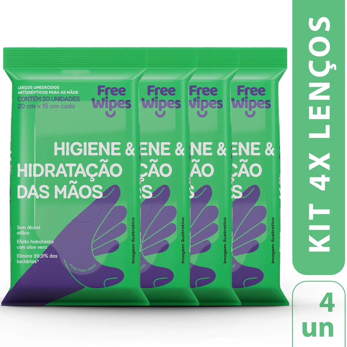 Free Wipes são lenços umedecidos antissépticos desenvolvidos para higienização das mãos e superfícies, com capacidade de eliminar 99% das bactérias. Possuem composição com efeito hidratante e fragrância de Aloe Vera, que não resseca as mãos e proporciona uma sensação agradável de limpeza.