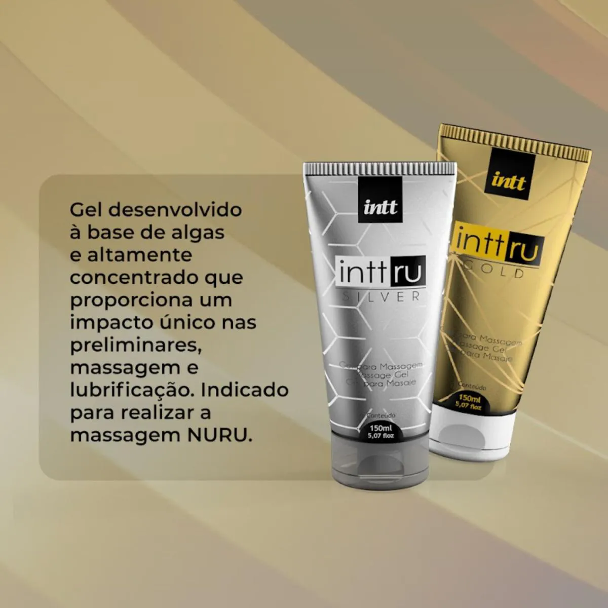 KIT CONTENDO 01 GEL CORPORAL RU GOLD + 01 GEL CORPORAL RU SILVER InttRu Gold – Uma Experiência de Massagem Sensorial e Sofisticada Criado especialmente para momentos íntimos, o InttRu Gold transforma a massagem corporal em uma verdadeira experiência de prazer e conexão. Sua textura sedosa e escorregadia desliza suavemente pela pele, facilitando os movimentos e proporcionando um toque envolvente e estimulante. Ideal para casais que desejam explorar novas sensações durante as preliminares, ele oferece uma experiência diferenciada, com alto nível de conforto e sensualidade. Graças à sua fórmula com alta viscosidade, o produto proporciona um toque mais intenso e prolongado, ideal para criar momentos únicos a dois. Sua fragrância sofisticada combina notas florais e amadeiradas com um delicado toque de baunilha, equilibrando sensualidade, doçura e elegância em um só produto. Diferenciais: Textura encorpada e deslizante, perfeita para massagens envolventes. Aroma marcante com flores, madeiras e baunilha. Sensações únicas com ou sem o uso de água morna. Modo de uso: Você pode utilizar o InttRu de duas formas: Aplicação direta: Abra a embalagem e aplique a quantidade desejada em qualquer parte do corpo, massageando com movimentos suaves. Com água morna: Em um recipiente, misture o InttRu com um pouco de água morna até obter uma consistência homogênea. O produto se torna ainda mais viscoso, rendendo o dobro e potencializando o prazer durante a massagem. Precauções: